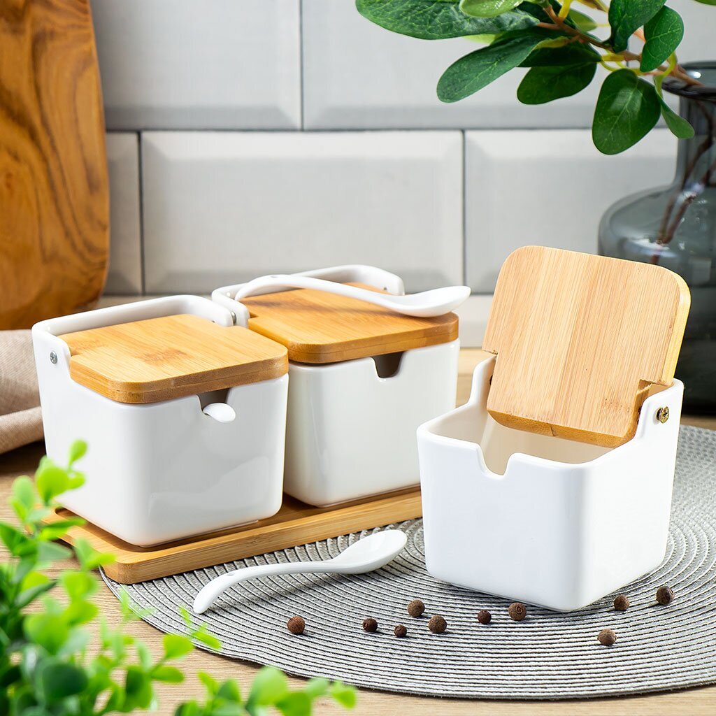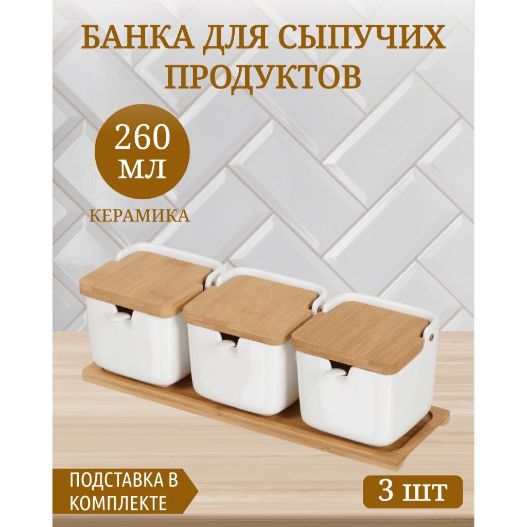 Вы можете приобрести «Банка для сыпучих продуктов, керамика, 0.26 л, 30х9.8 см, 3 шт, с крышкой, с ложкой, бамбуковая подставка, Y4-5027, белая» и другие товары в нашем интернет-магазине в Серпухове по низким ценам и с бесплатным самовывозом.