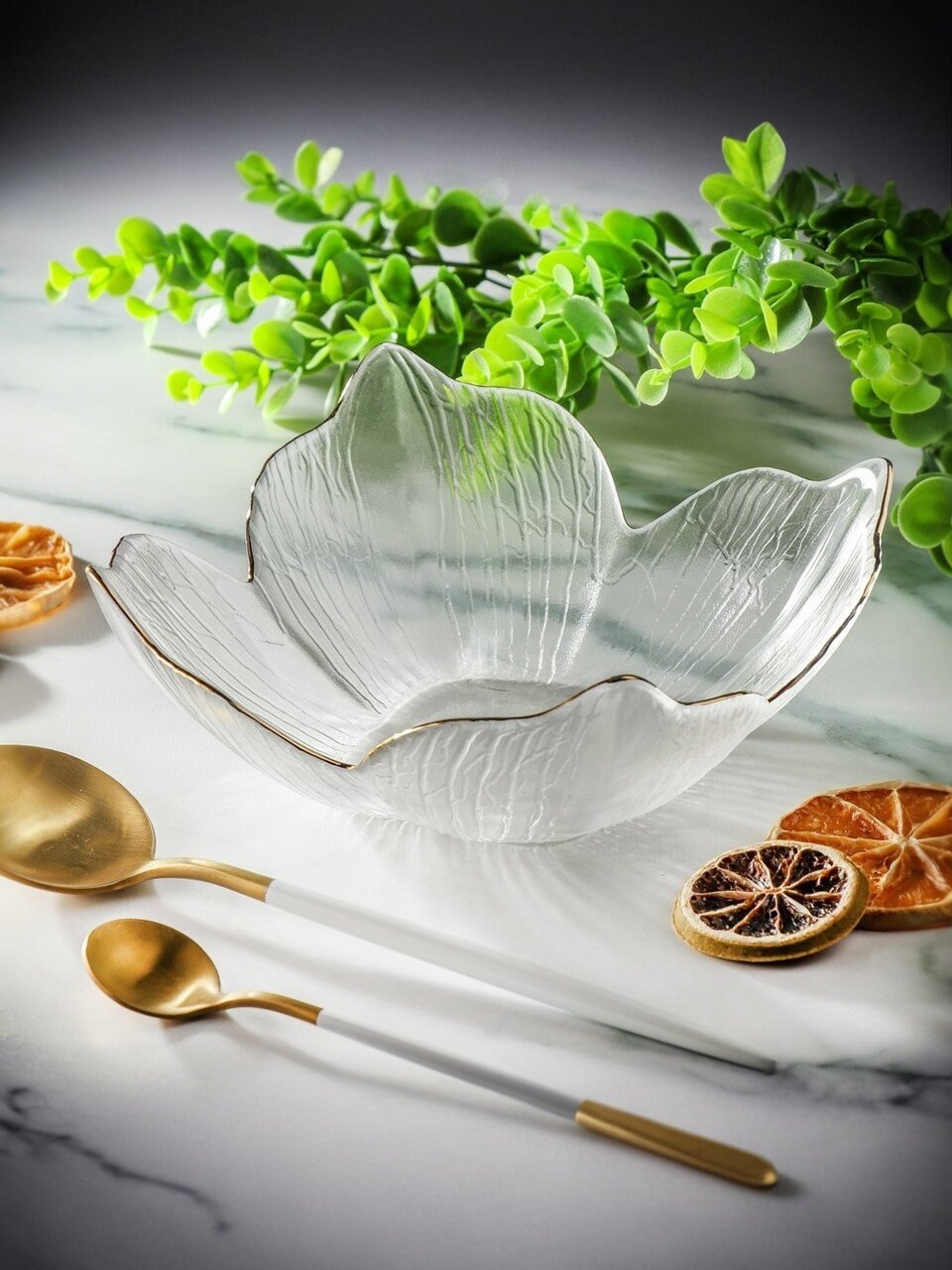 Стеклянные блюда украсят любой праздничный стол. Модель Y4-6576 отлично подойдет для подачи салатов. Изящная форма цветка с золотистой каймой добавит элегантности сервировке и подчеркнет Ваш вкус.