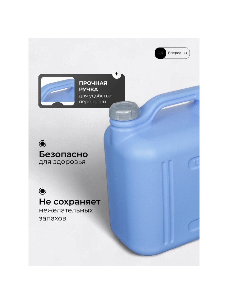 Канистра изготовлена из высококачественного пластика, который обеспечивает долговечность и надежность в использовании. Объем 15 литров позволяет хранить достаточное количество воды, что особенно важно в условиях, где доступ к водопроводу ограничен. Прямоугольная форма обеспечивает удобство в хранении и транспортировке, позволяя экономить место.
