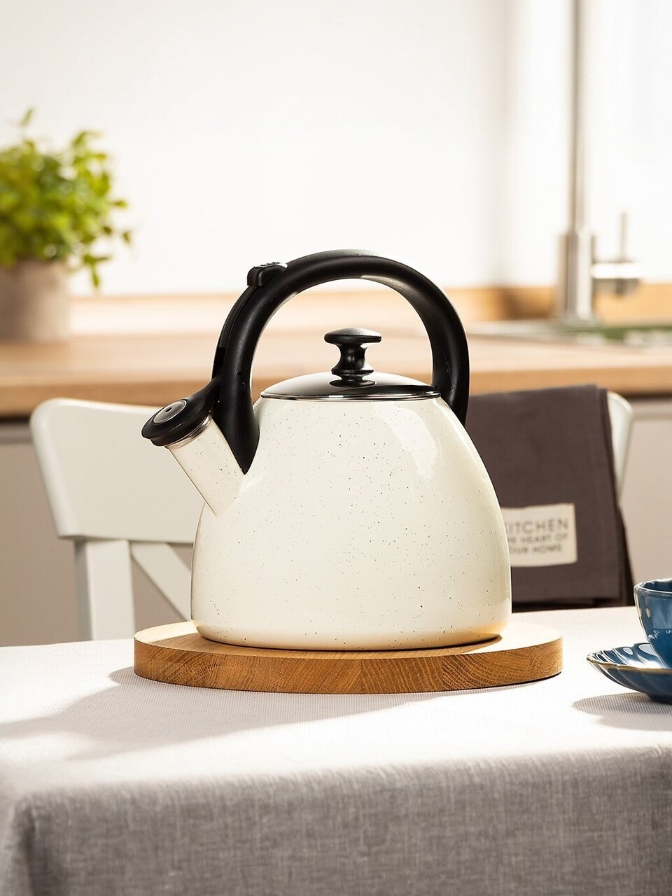 Чайник Daniks Lino изготовлен из прочной стали с эмалированным покрытием, что гарантирует долгий срок службы и устойчивость к повреждениям. Бежевый цвет добавит изысканности и стиля в интерьер вашей кухни. Этот чайник совместим с различными видами плит, включая индукционные, газовые, галогеновые, стеклокерамические и электрические, что делает его универсальным решением для любого дома.