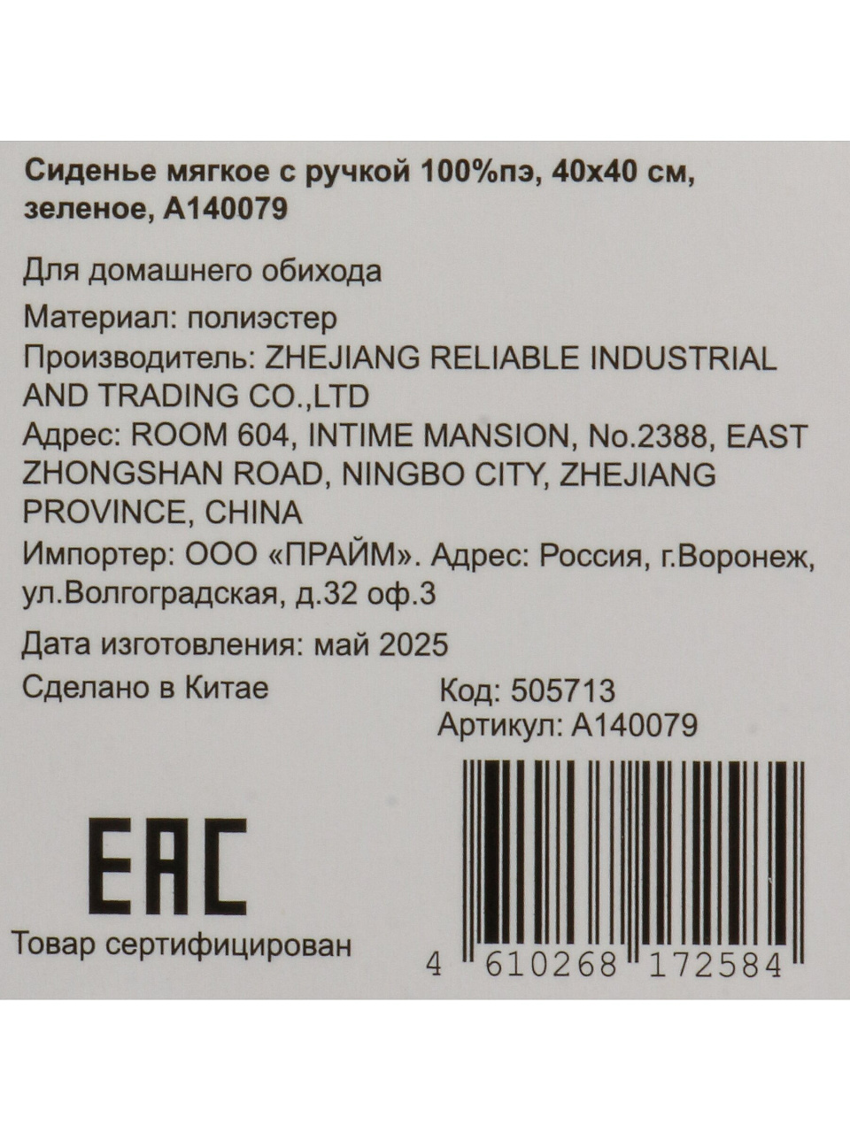 Сиденье мягкое с ручкой 100%пэ, 40х40 см, зеленое, A140079