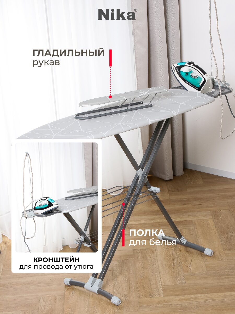 Доска гладильная Nika 122х40 см с подставкой для утюга, рукавом, розеткой и полкой — комфорт для глажки дома и на даче, всё под рукой, экономия времени.