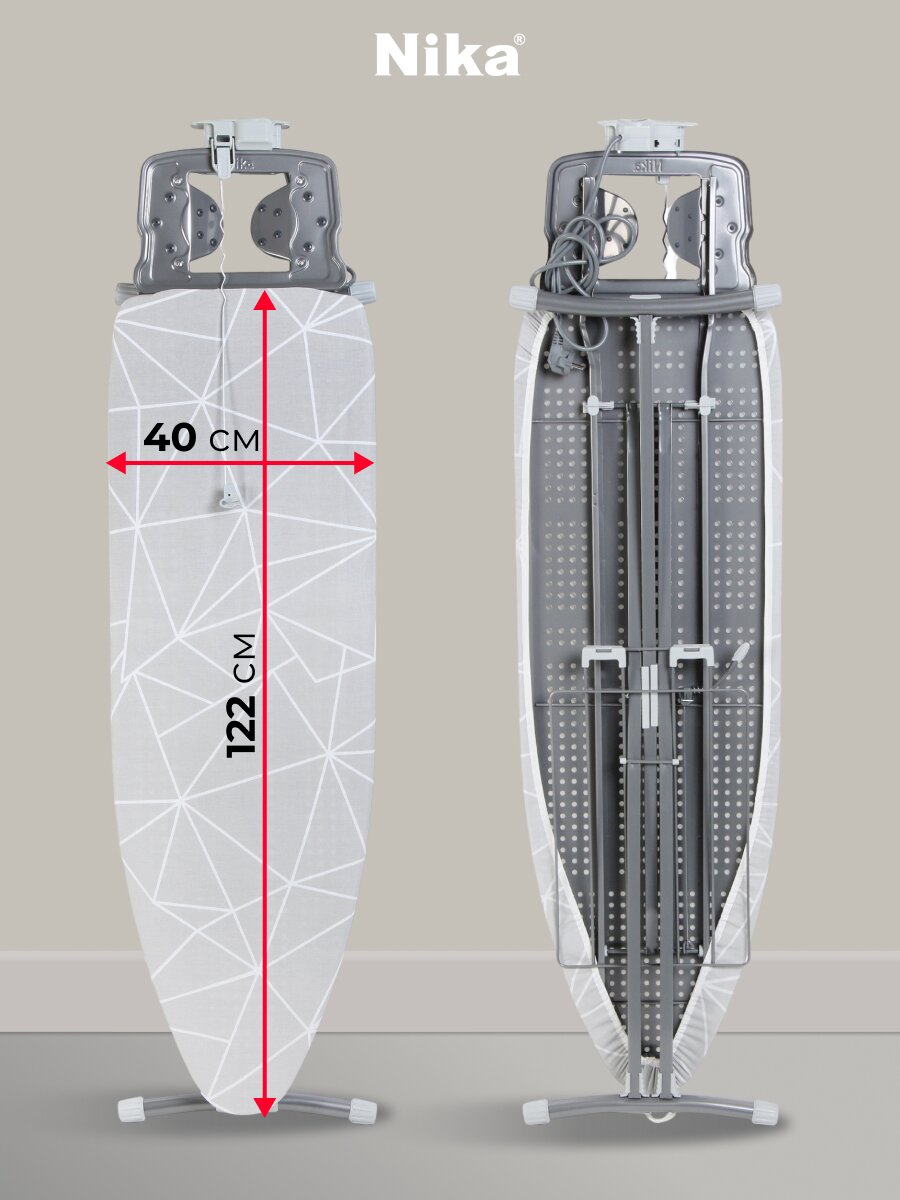 В отличие от стандартных моделей, здесь предусмотрена отдельная зона для глажки рукавов и полка для белья — вы можете сразу сортировать вещи и экономить время. Высота регулируется под ваш рост, что снижает нагрузку на спину. Часто спрашивают: «Чем отличается доска Nika от других?» — ответ: расширенный функционал, прочный металл, надёжная фиксация и продуманная эргономика. Подходит ли для больших простыней и мужских рубашек? Да, размеры 122×40 см позволяют комфортно гладить крупные вещи без складок.