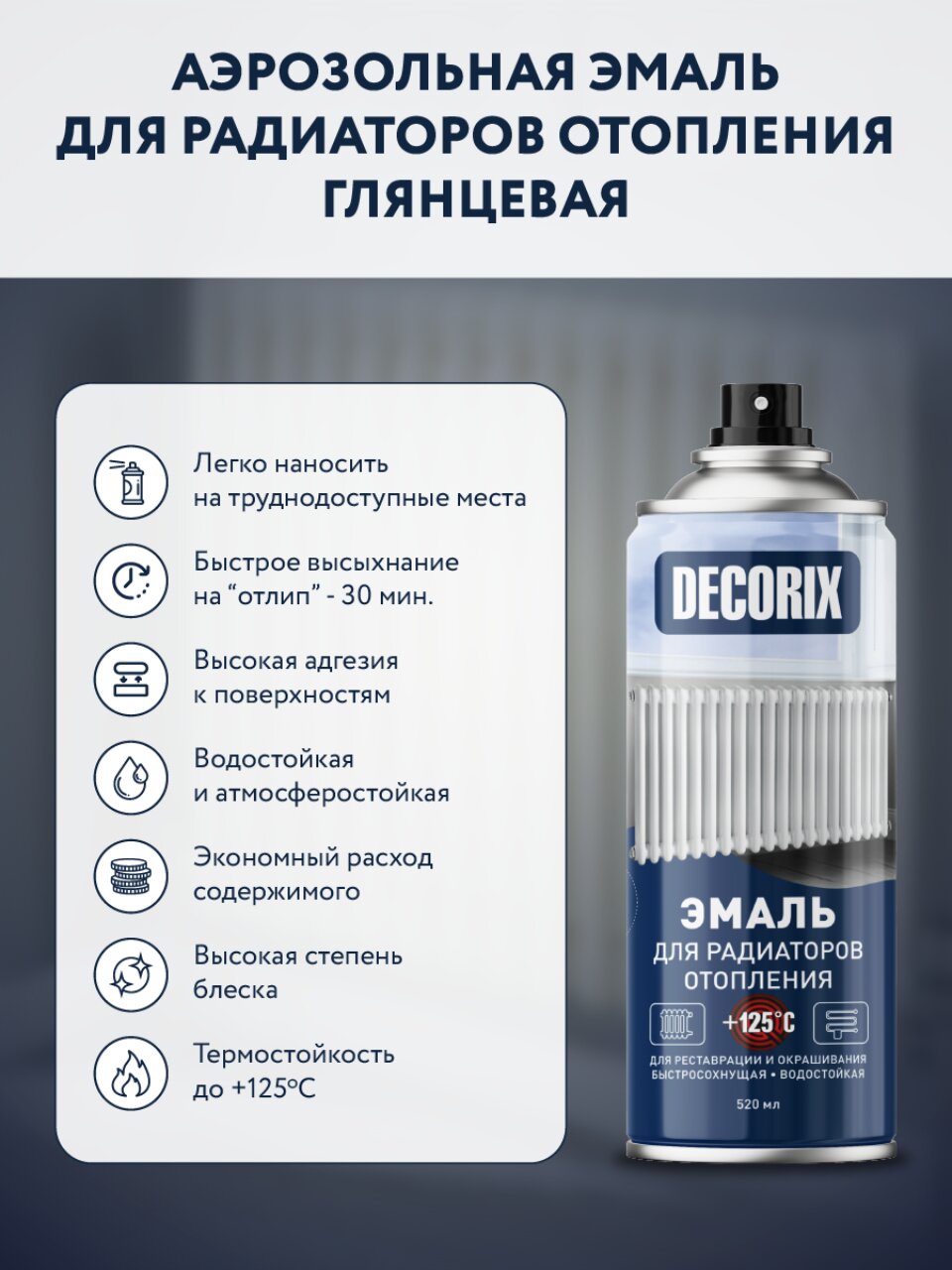 Высококачественная акриловая эмаль для отопительных приборов DECORIX предназначена для окрашивания радиаторов отопления, водонагревателей, труб, элементов конструкций отопительных систем и других поверхностей с температурой нагревания до +125°С, а также для бытового применения, строительства и ремонта.