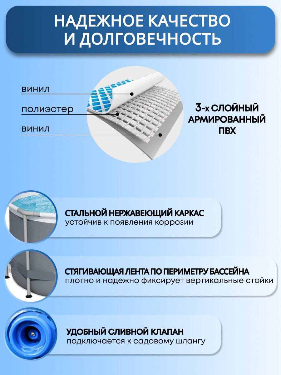 Выбирая бассейн Bestway Power Steel Oval Pool, вы получаете не только качественный и надежный продукт, но и возможность создать на своем участке уголок для отдыха и развлечений. Бассейн не только украсит ваш сад, но и станет центром притяжения для всей семьи и друзей. Наслаждайтесь освежающим купанием в жаркие дни и забудьте о поездках на переполненные пляжи. Это идеальное решение для тех, кто ценит комфорт и качество. Рекомендуется разбирать бассейн на холодное время года для продления срока службы.