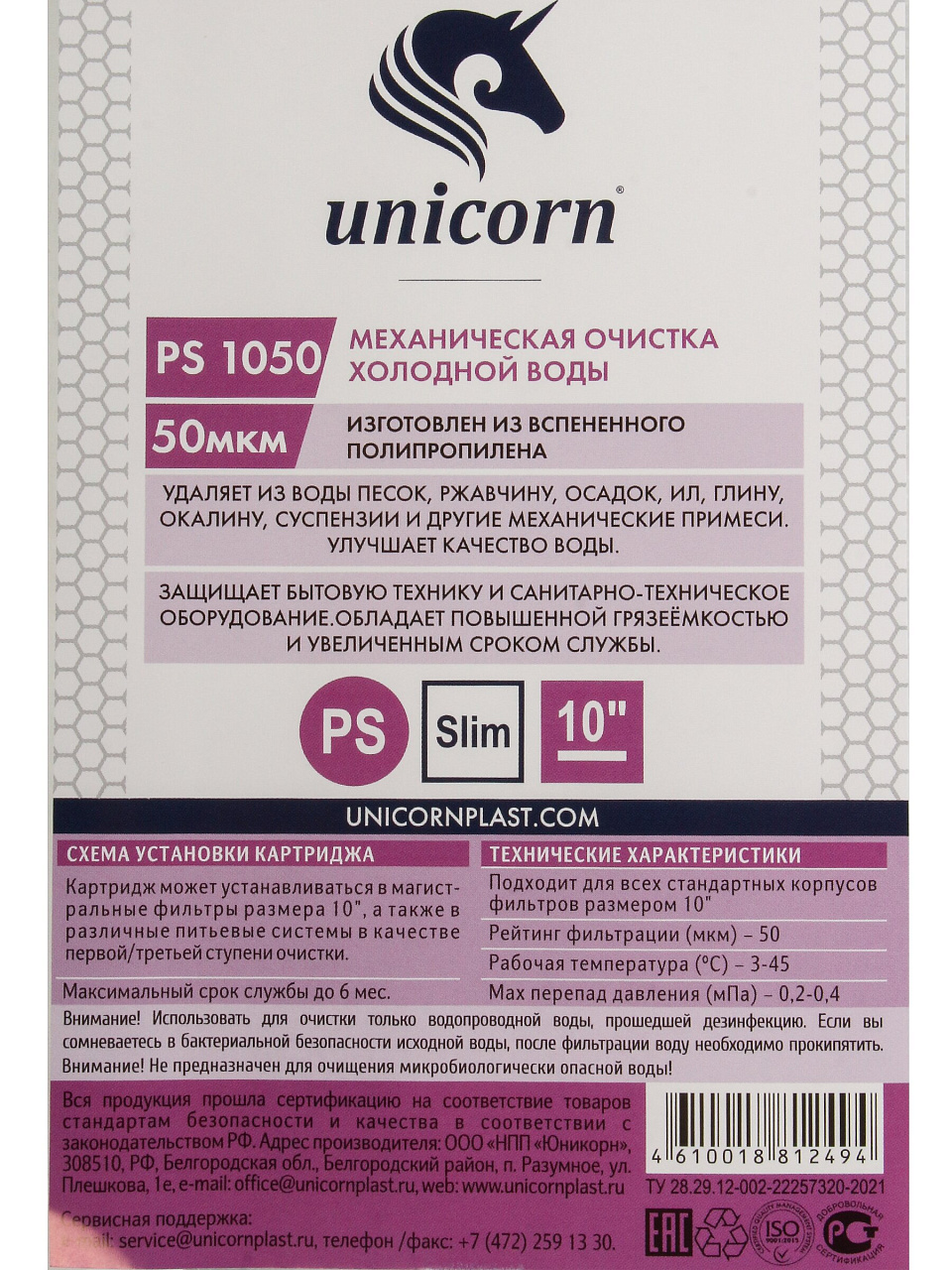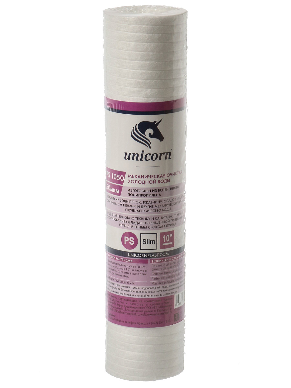 Ориентируйтесь на типоразмер корпуса (10 Slim Line), материал (вспененный полипропилен) и размер фильтруемых частиц (50 мкм). Unicorn PS 1050 совместим с большинством бытовых фильтров для холодной воды.