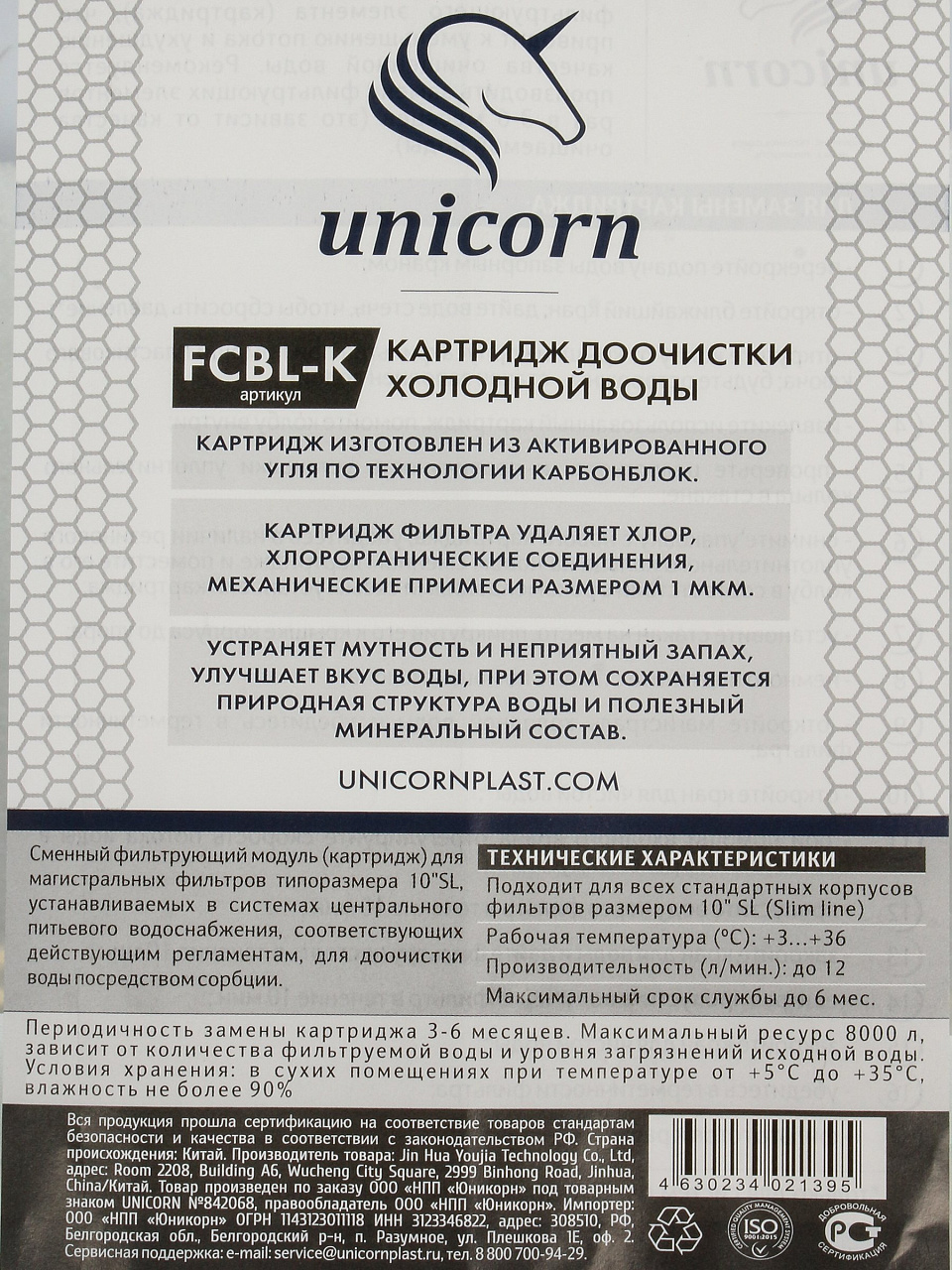 Картридж Unicorn FCBL-К 10: очистка воды от хлора до 1 мкм. Ресурс 8000 л, стандарт Slim Line. Закажите с доставкой для чистой воды дома.