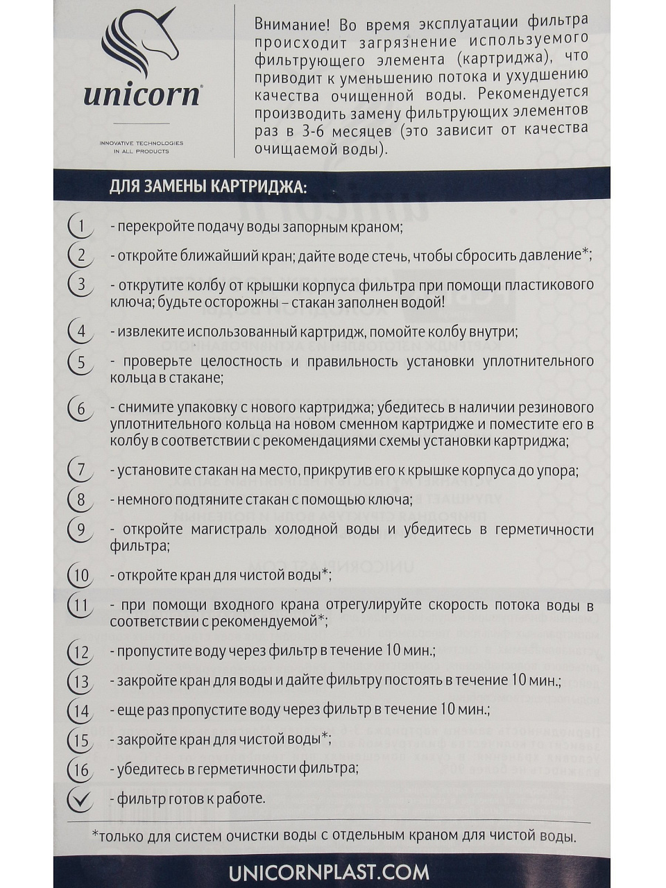 Обеспечьте свою семью кристально чистой водой уже сегодня. Добавьте картридж Unicorn в корзину, чтобы воспользоваться быстрой доставкой и гарантией качества от проверенного производителя.