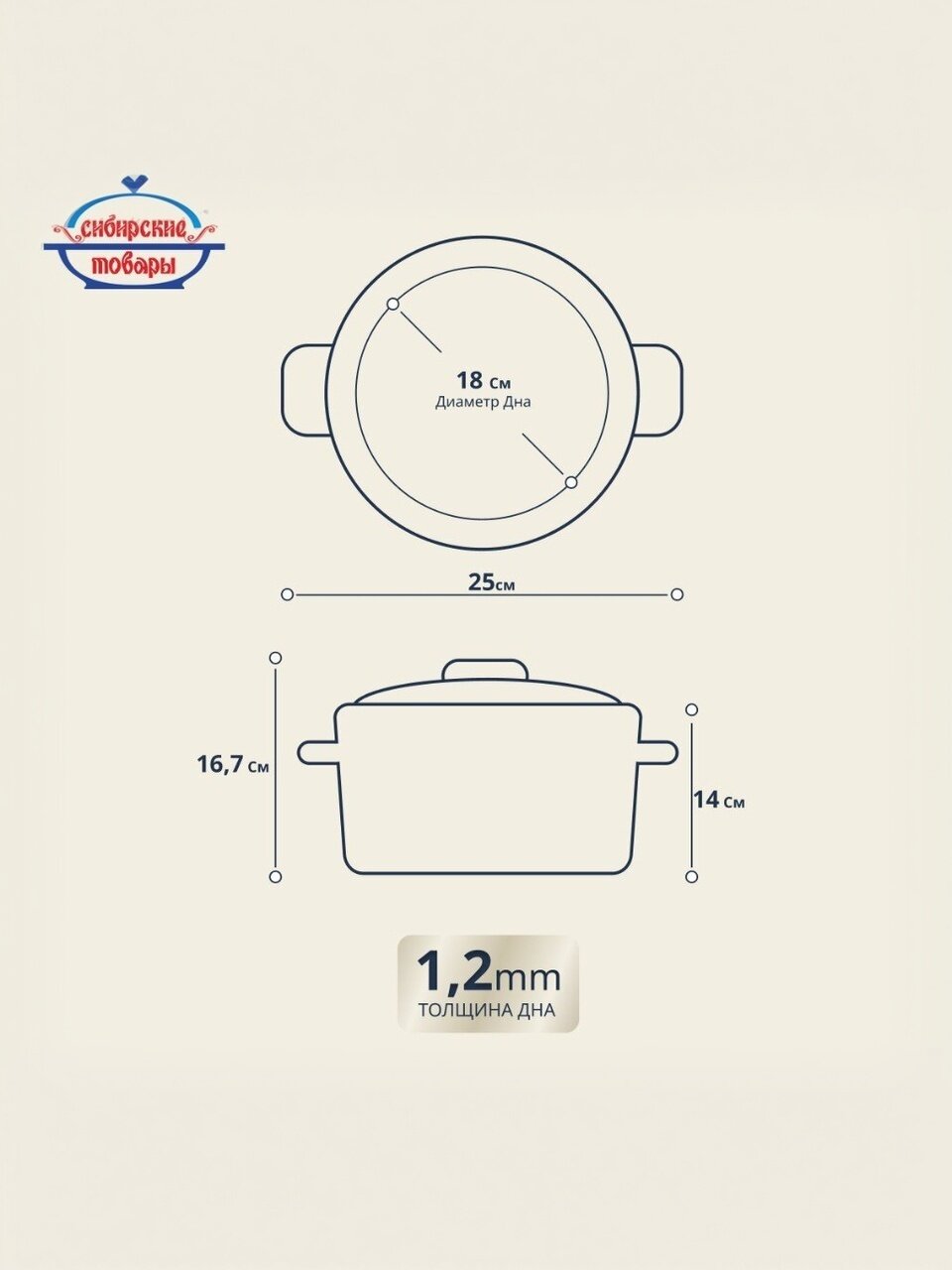 - Оптимальный объём 3.5 л, диаметр 18 см, подходит для большинства блюд и плит