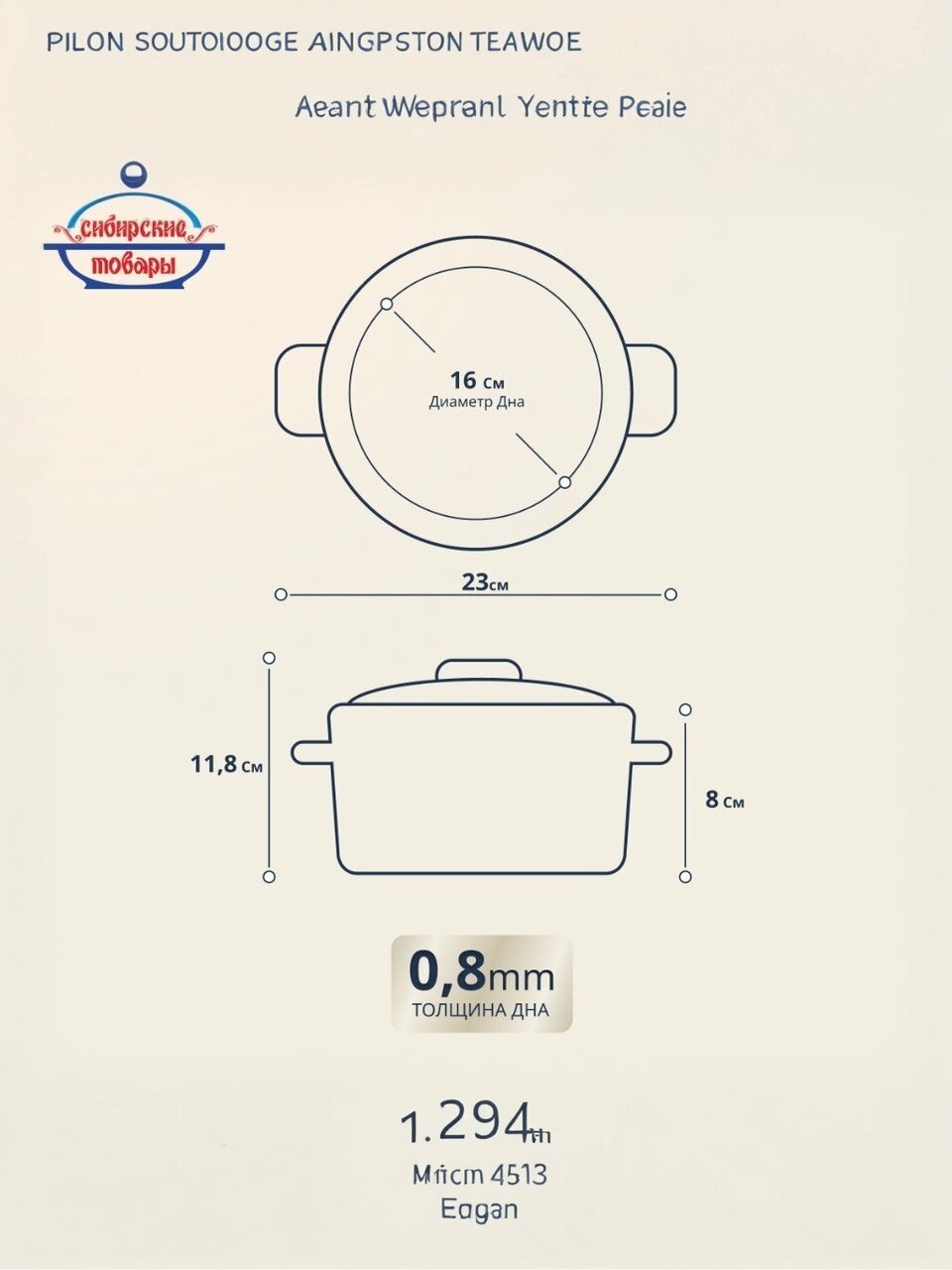 Объём — 1,5 литра, диаметр и размер крышки — 16 см, высота с крышкой — 11,8 см, без крышки — 8 см, толщина дна — 0,8 мм.