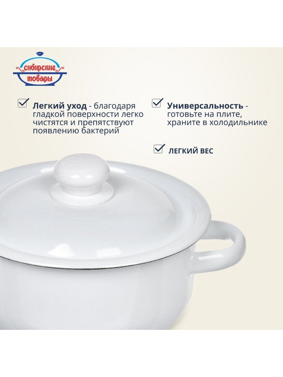 Эмалированная кастрюля 1,5 л «Сибирские товары» — практичное решение для кухни, дачи и подарка: долговечная сталь, универсальный размер, легкий уход.