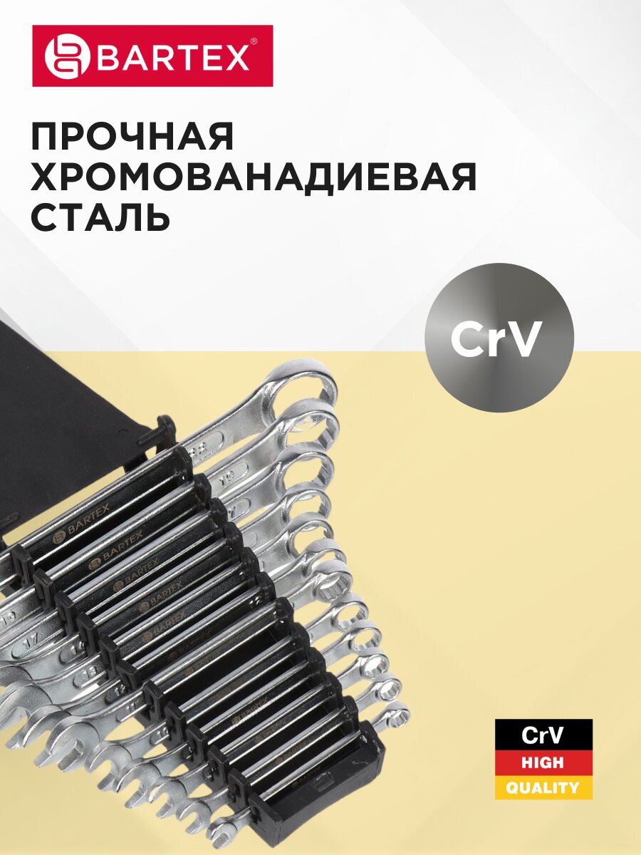 Комбинированный набор Bartex состоит из 12 рожковых и накидных ключей. U-образный рабочий профиль захватывает крепеж с двух или трех сторон. Профиль О захватывает крепежный элемент со всех сторон, что позволяет работать с тугими соединениями.