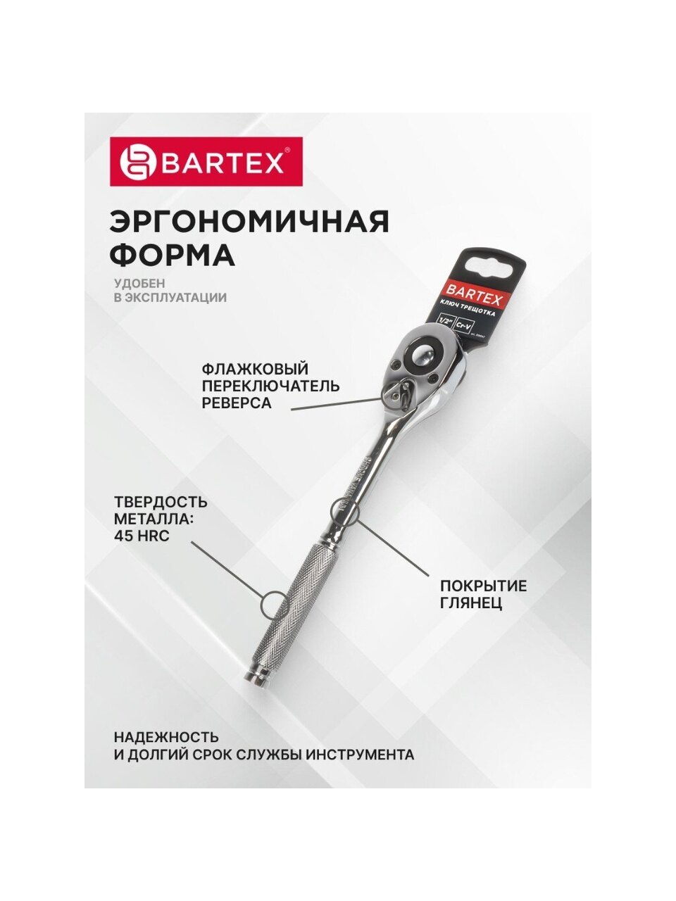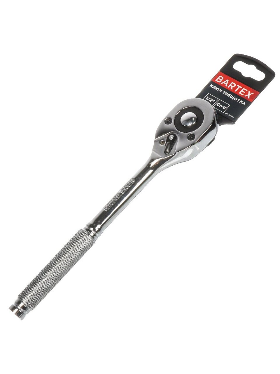 Ключ-трещотка Bartex незаменим при обслуживании автотранспорта, ремонте инженерных систем, монтаже и демонтаже крепежных элементов. Реверс легко переключается флажковым механизмом. Ключ позволяет как откручивать, так и закручивать гайку при помощи реверсивного устройства, не снимая его со сменной головки.