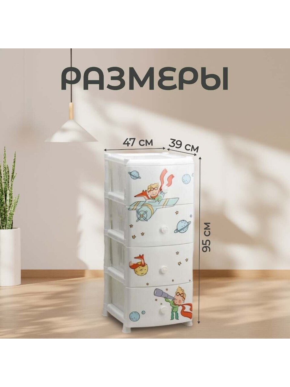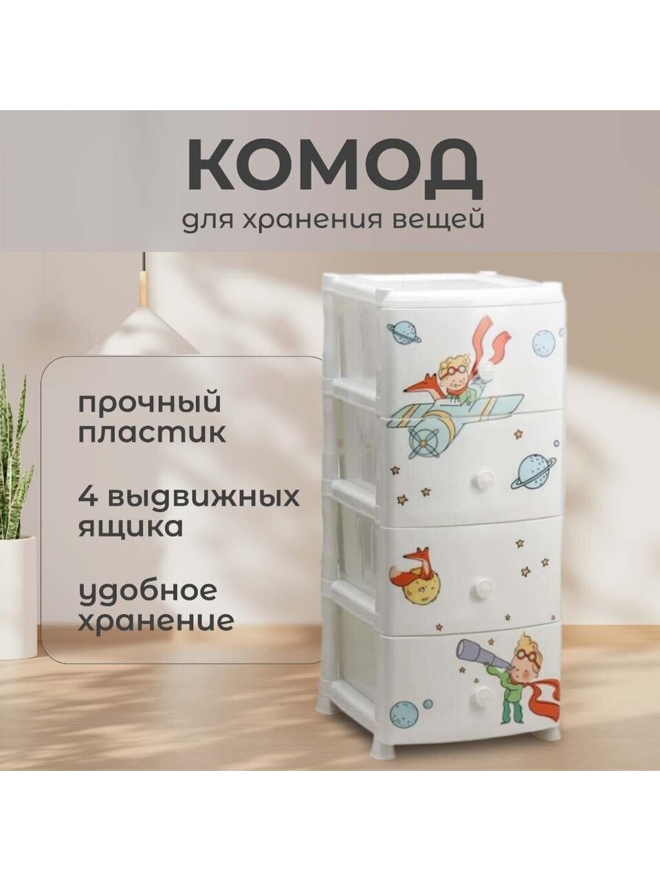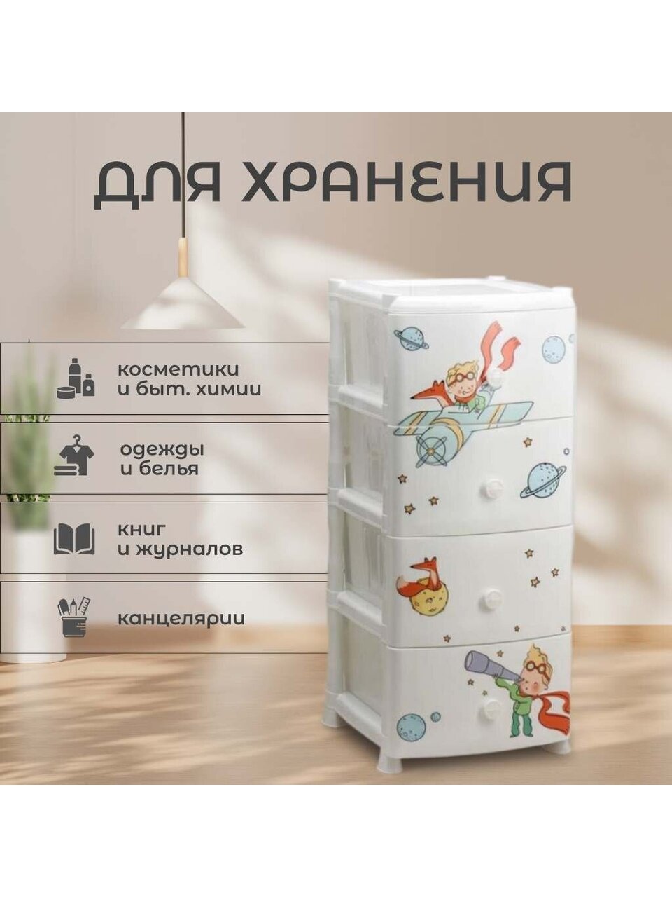 Комод из пищевого пластика с четырьмя выдвижными ящиками предназначен для хранения вещей и продуктов питания и гармонично впишется в интерьер любой комнаты. Легкий и вместительный комод поможет обеспечить порядок, избавит от разбросанных игрушек или одежды, убережет продукты от пыли и заветривания. Передние панели комода декорированы по технологии IML (вплавляемая этикетка) для создания индивидуального стиля. Не рекомендуется размещение пластикового комода вблизи батарей центрального отопления и электрических обогревателей. Максимальная нагрузка на 1 ящик комода равна 12 кг. Максимальная нагрузка на комод из 4х ящиков равна 48 кг.