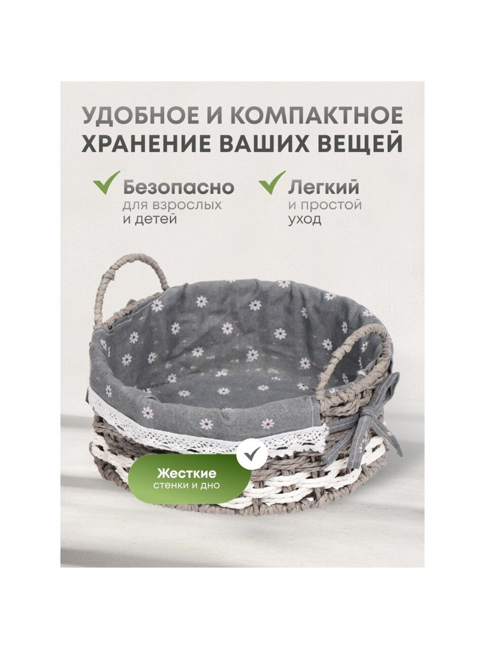 На внутреннюю поверхность корзинки надет съемный чехол с принтом, благодаря которому крошки не просыпаются на стол. Корзинка очень практична и легка.
