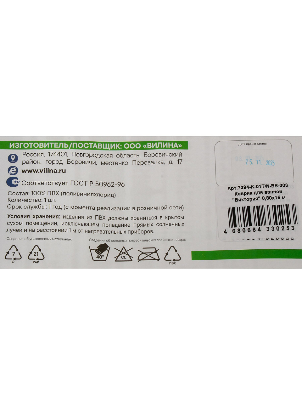Коврик для ванной 0.8х15 м Вилина Виктория — максимальная защита от скольжения, долговечность и стильный орнамент для комфортной ванной по выгодной цене.