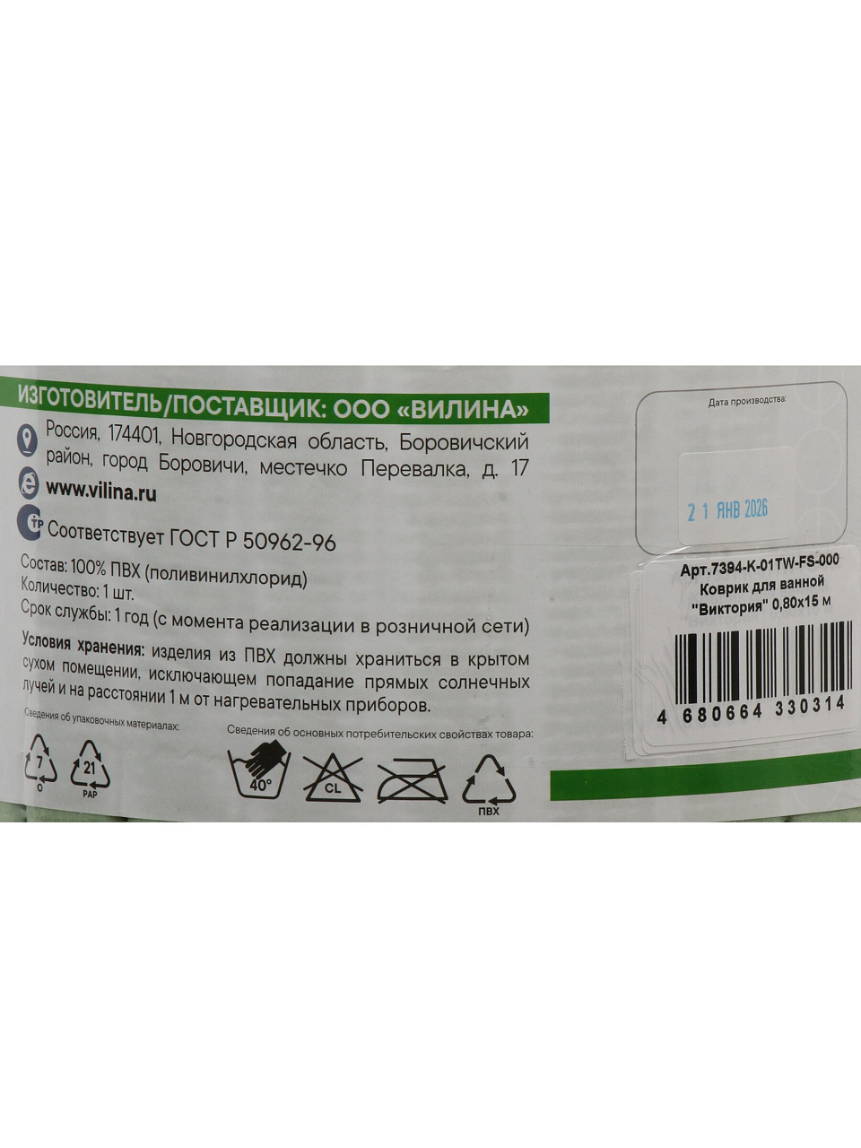 Коврик для ванной, антискользящий, 0.8х15 м, вспененный ПВХ, фисташка, Вилина, Виктория, FS