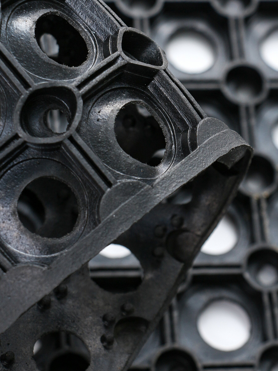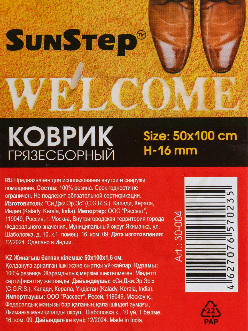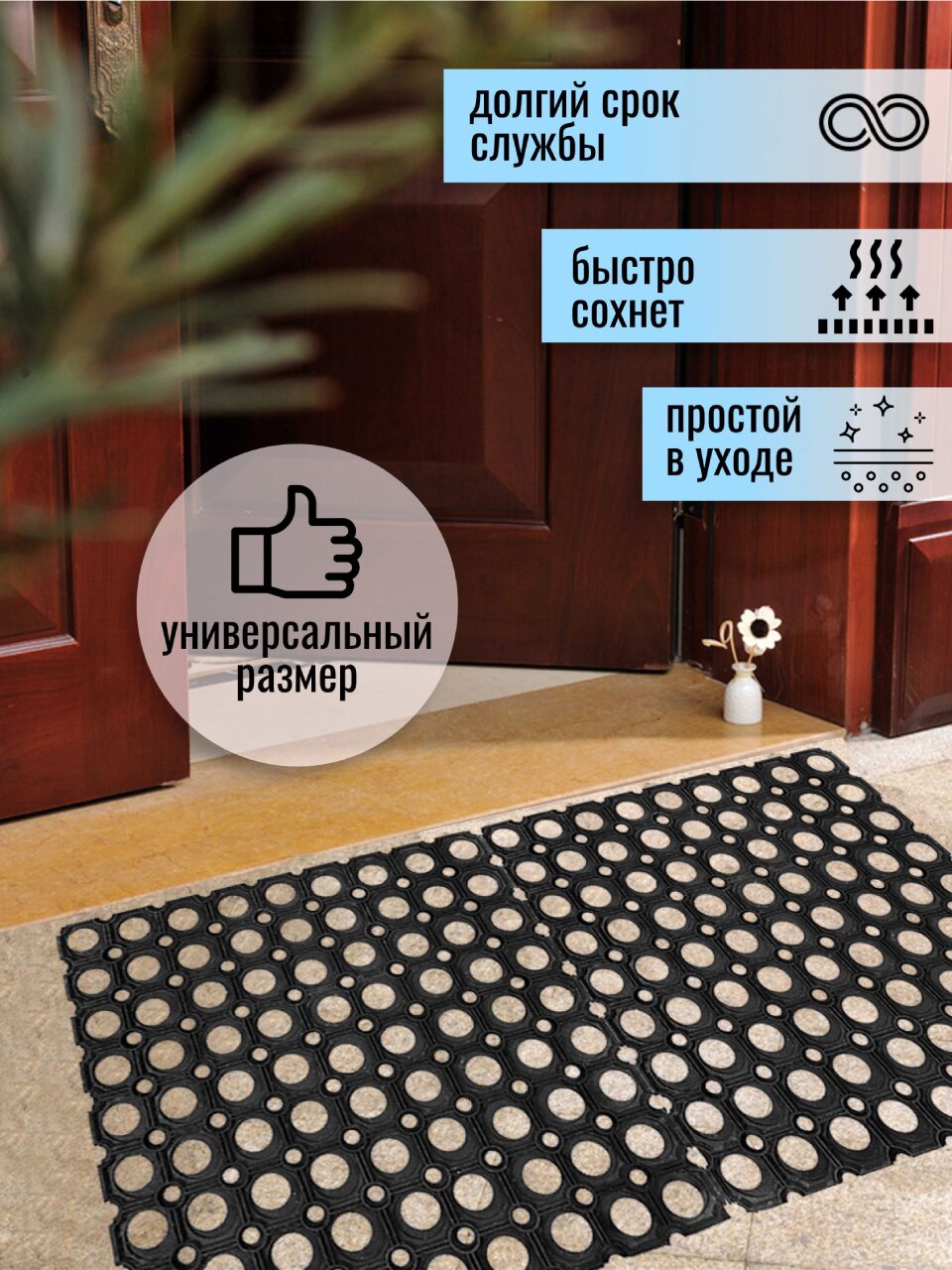 Придверный коврик изготовлен из прочной и долговечной резины. Конструкция коврика имеет специальные ребра, которые помогают более эффективно удалять грязь с обуви, а отверстия в конструкции удаляют излишки воды. С внутренней стороны имеются антискользящие шипы.