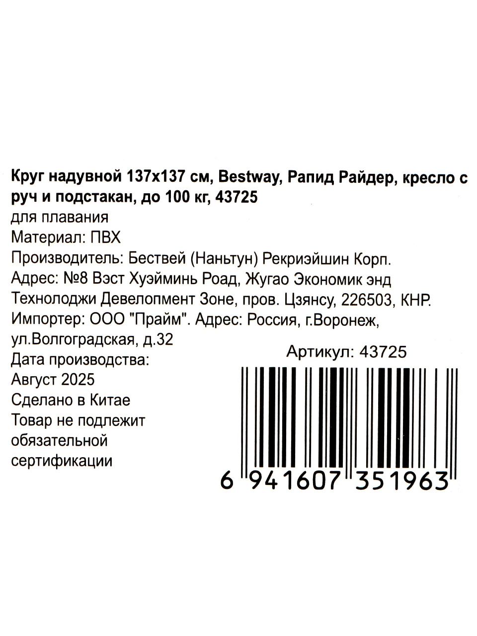 Вы можете приобрести «Круг надувной 137х137 см, Bestway, Рапид Райдер, кресло с ручками и подстаканником, до 100 кг, 43725» и другие товары в нашем интернет-магазине в Ставрополе по низким ценам и с бесплатным самовывозом.