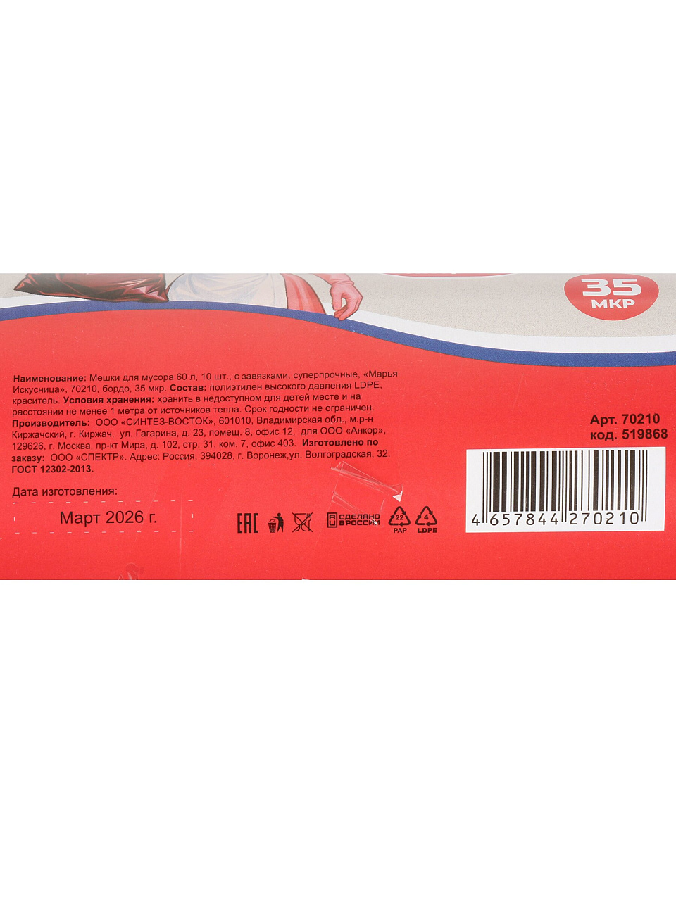 Вы можете приобрести «Пакеты для мусора 60 л, 10 шт, суперпрочные, с ручками, с завязками, Марья Искусница, 70210, бордо» и другие товары в нашем интернет-магазине в Россоши по низким ценам и с бесплатным самовывозом.