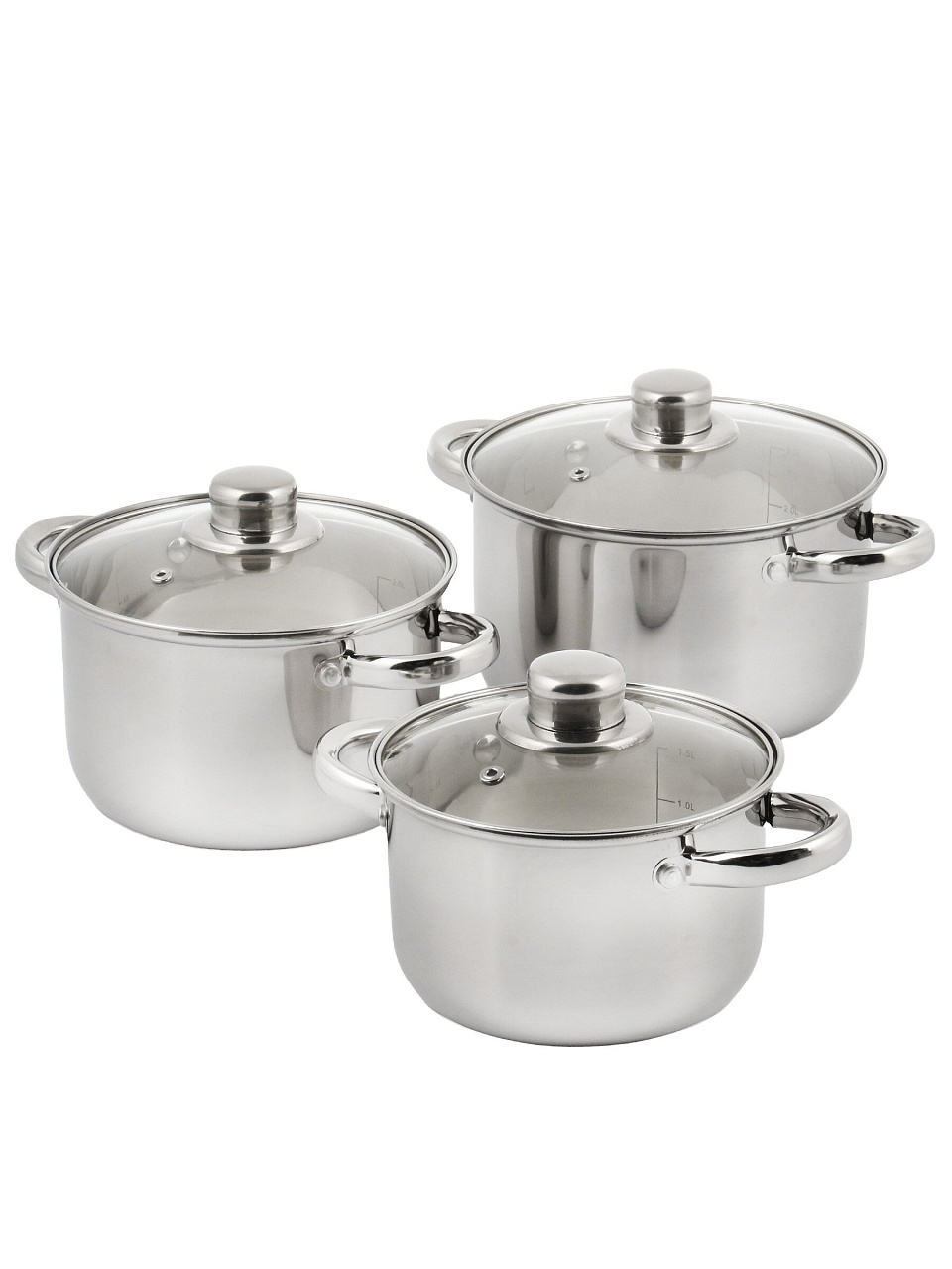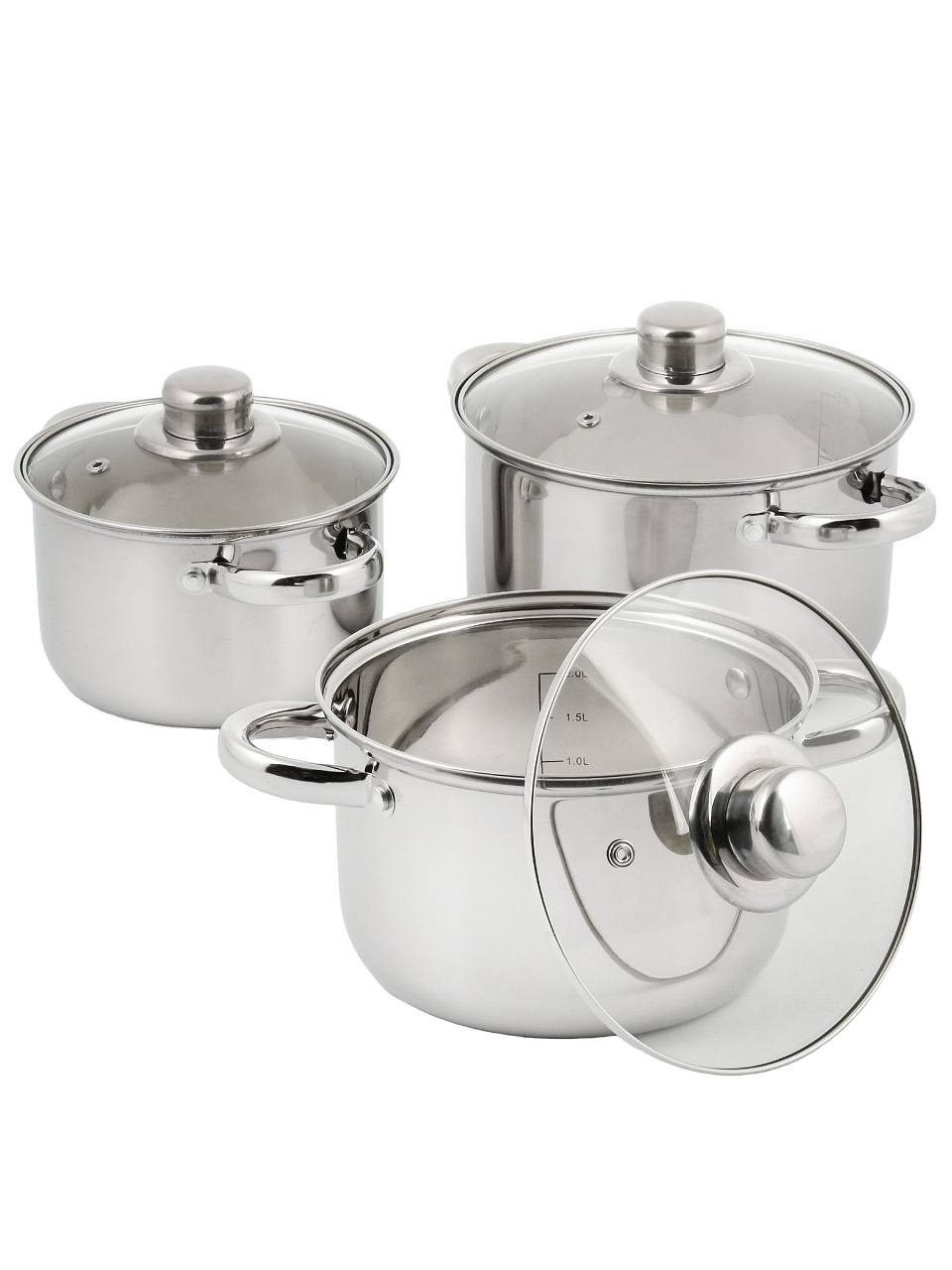 В комплекте три кастрюли объемом 1.9, 2.9 и 3.9 литра, каждая с отдельной стеклянной крышкой.
