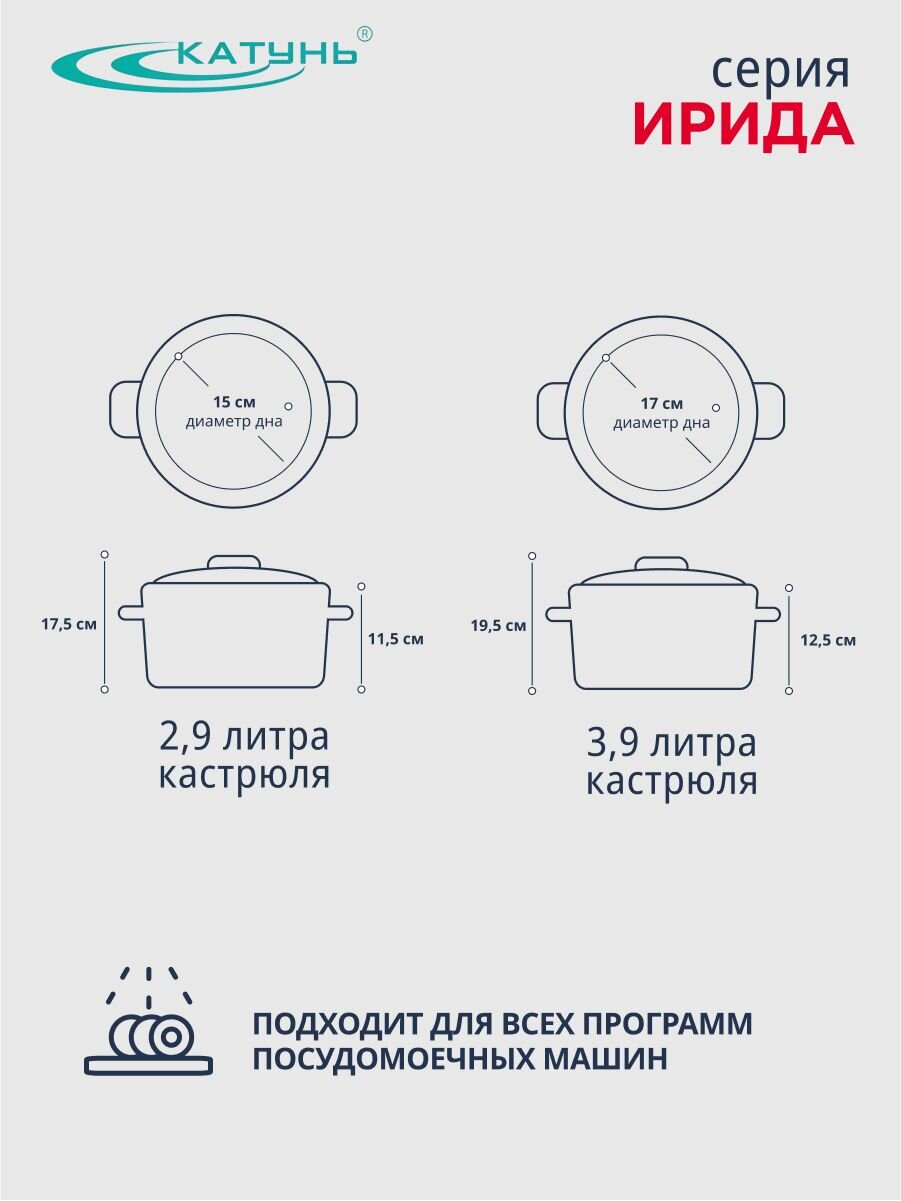В отличие от аналогов с эмалированным или алюминиевым корпусом, нержавеющая сталь Катунь Ирида не подвержена сколам и сохраняет внешний вид даже при интенсивном использовании. Часто спрашивают, подходит ли этот набор для готовки на даче или в квартире — благодаря универсальным объёмам (2.9 и 3.9 л) и прочным материалам вы сможете готовить супы, гарниры, варить компоты, использовать для заготовок. Как использовать набор? Просто выберите нужный объём и плиту — посуда быстро нагревается и равномерно распределяет тепло.
