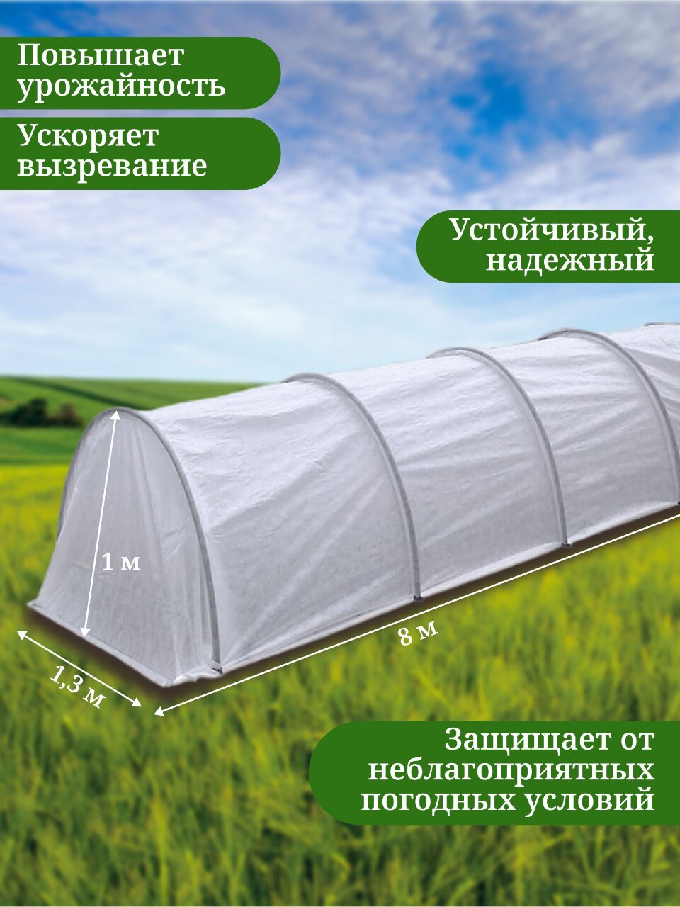 Парник выполнен из высококачественного спанбонда плотностью 55 г/м2, который обеспечивает надежную защиту растений, пропуская достаточное количество света и воздуха. Каркас из пластика с дугами длиной 3.7 м гарантирует прочность и устойчивость конструкции. Благодаря клипсам для крепления, установка и демонтаж парника становятся легкими и удобными, что позволяет быстро адаптироваться к изменениям погоды.