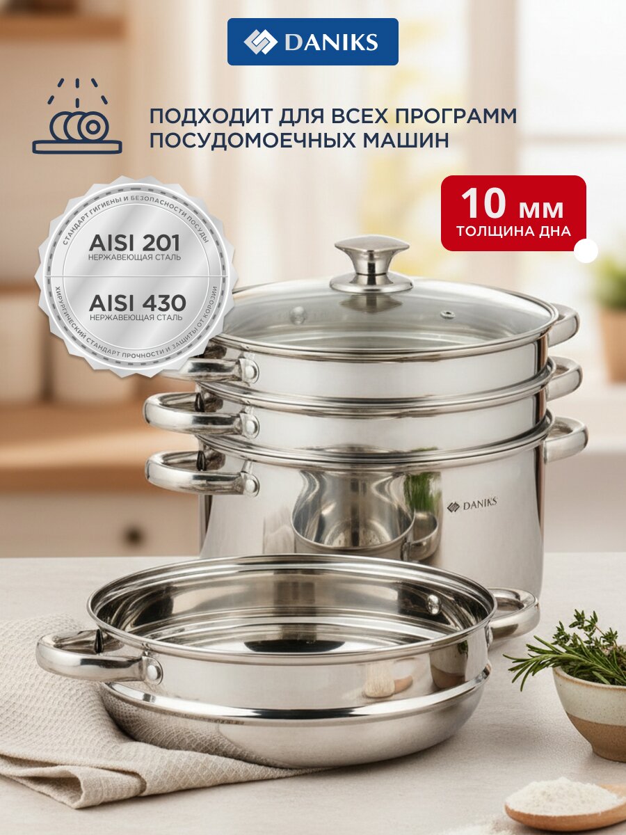 Вы можете приобрести «Мантоварка нержавеющая сталь, 26 см, 7 л, 4 секции, Daniks, крышка стекло, индукция, металлические ручки, глянец, SD-S26-4» и другие товары в нашем интернет-магазине в Серпухове по низким ценам и с бесплатным самовывозом.