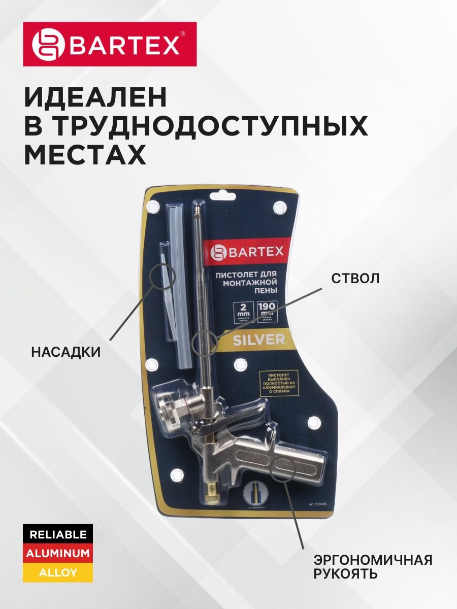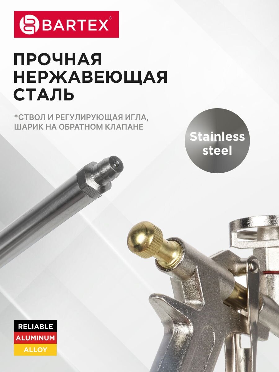 Модель Bartex CY-058 Silver герметично заполняет зазоры и фиксирует элементы конструкций. Пистолет обеспечивает более качественную работу с монтажной пеной. Это достигается за счет возможности точного регулирования потока.