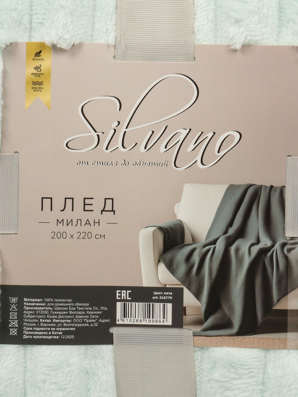 Плед евро Silvano Милан 200х220 см — уют, стиль и тепло для вашего дома: микрофибра 280 г/м2, мятный цвет, идеален для кровати и дивана.