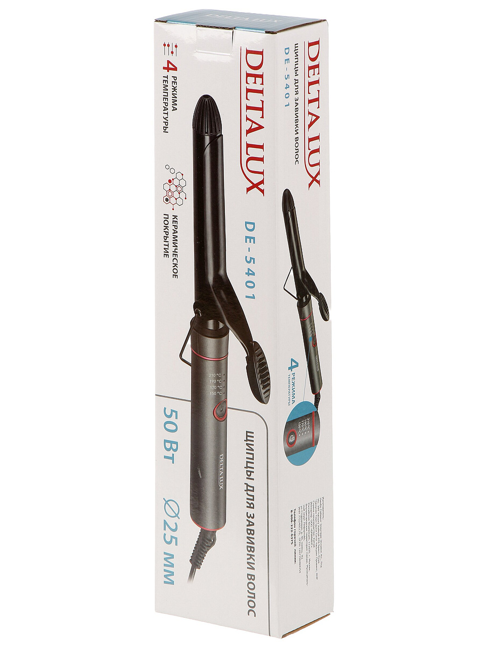 Вы можете приобрести «Щипцы Delta Lux, для завивки волос, 50 Вт, керамическое покрытие, 4 режима, 210 °, 25 мм, темно-серые, DE-5401» и другие товары в нашем интернет-магазине в Воронеже по низким ценам и с бесплатным самовывозом.