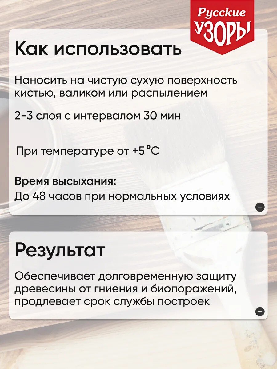 - Применяется для обработки деревянных строительных конструкций (не для декоративного покрытия);