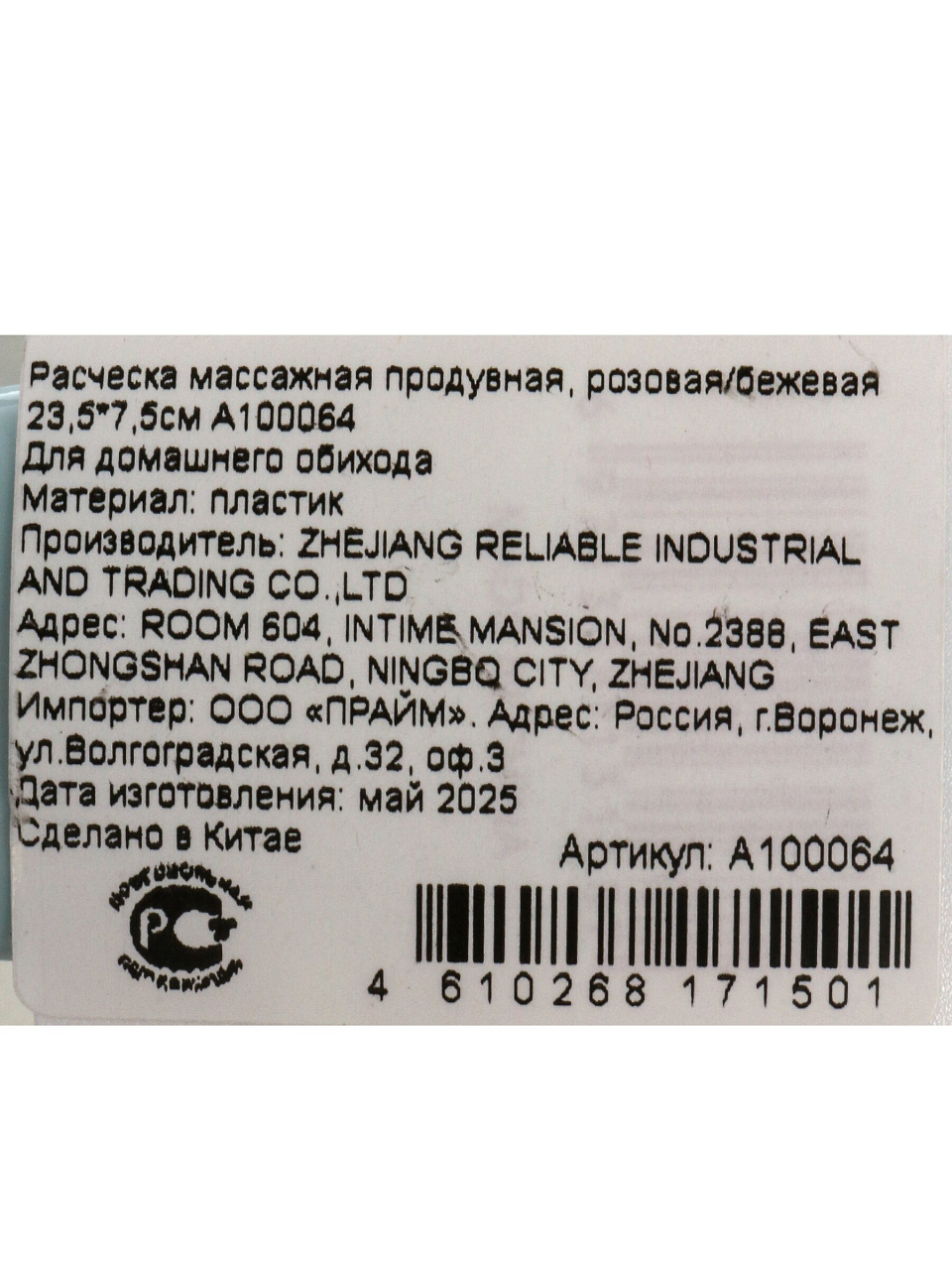Расческа массажная продувная, 23.5х7.5см, роз, беж, A100064