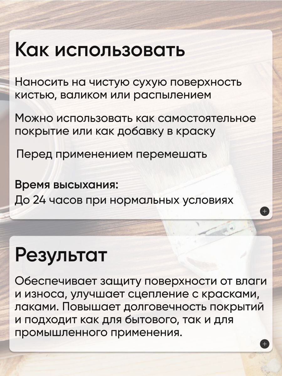 Использование олифы НХП способствует созданию прочного и долговечного покрытия, которое защищает материалы от негативного воздействия окружающей среды. Применение на деревянных и бетонных поверхностях позволяет предотвратить растрескивание, деформацию и преждевременное старение. Олифа подчеркивает натуральную красоту древесины, придавая поверхности насыщенный коричневый оттенок. Благодаря термополимерной технологии, покрытие становится более устойчивым к истиранию и механическим повреждениям, что особенно актуально для часто используемых поверхностей в доме и на даче.