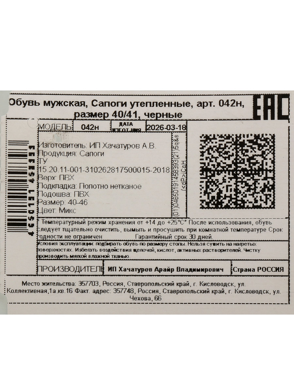 Сапоги для мужчин, ПВХ, черные, р. 40-41, утепленные, 042н
