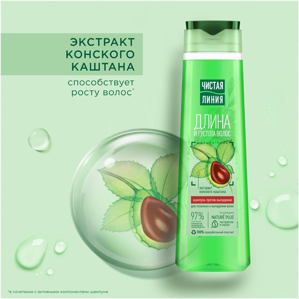 Шампунь от экспертов бренда Чистая Линия содержит активные натуральные компоненты, которые предупреждают выпадение, питают и защищают волосы от повреждений. Кроме того, продукт на 97% состоит из компонентов натурального происхождения. Новая формула шампуня содержит эссенцию, в составе которой пять экстрактов и масел (экстракт вербены, экстракт шалфея, экстракт шиповника, масло миндаля и льна).