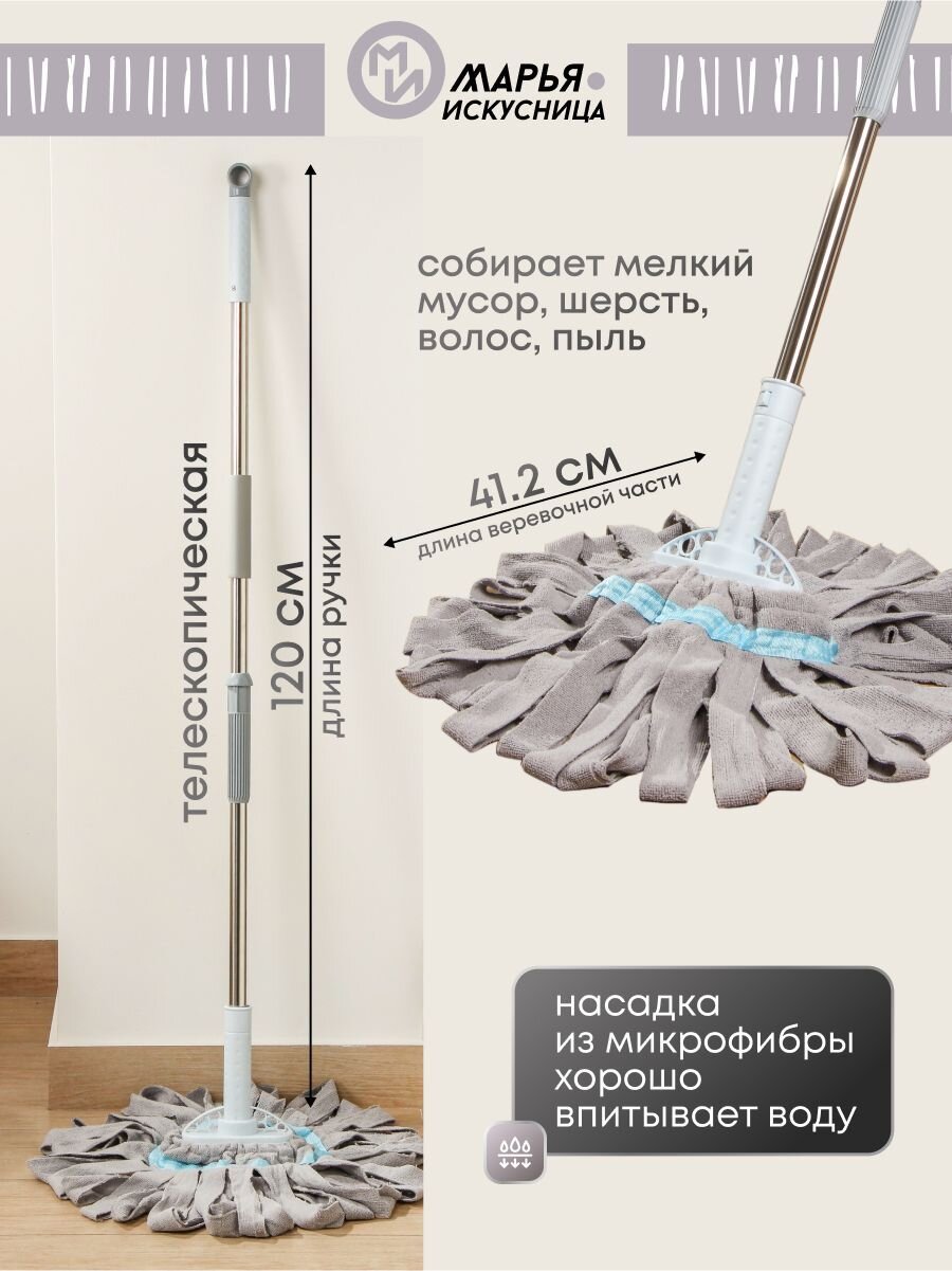 Швабра веревочная с микрофиброй 140х41,2 см Марья Искусница Y6-10768 — быстрое и эффективное решение для уборки пола дома и на даче. Удобный отжим, прочная ручка, универсальный размер.