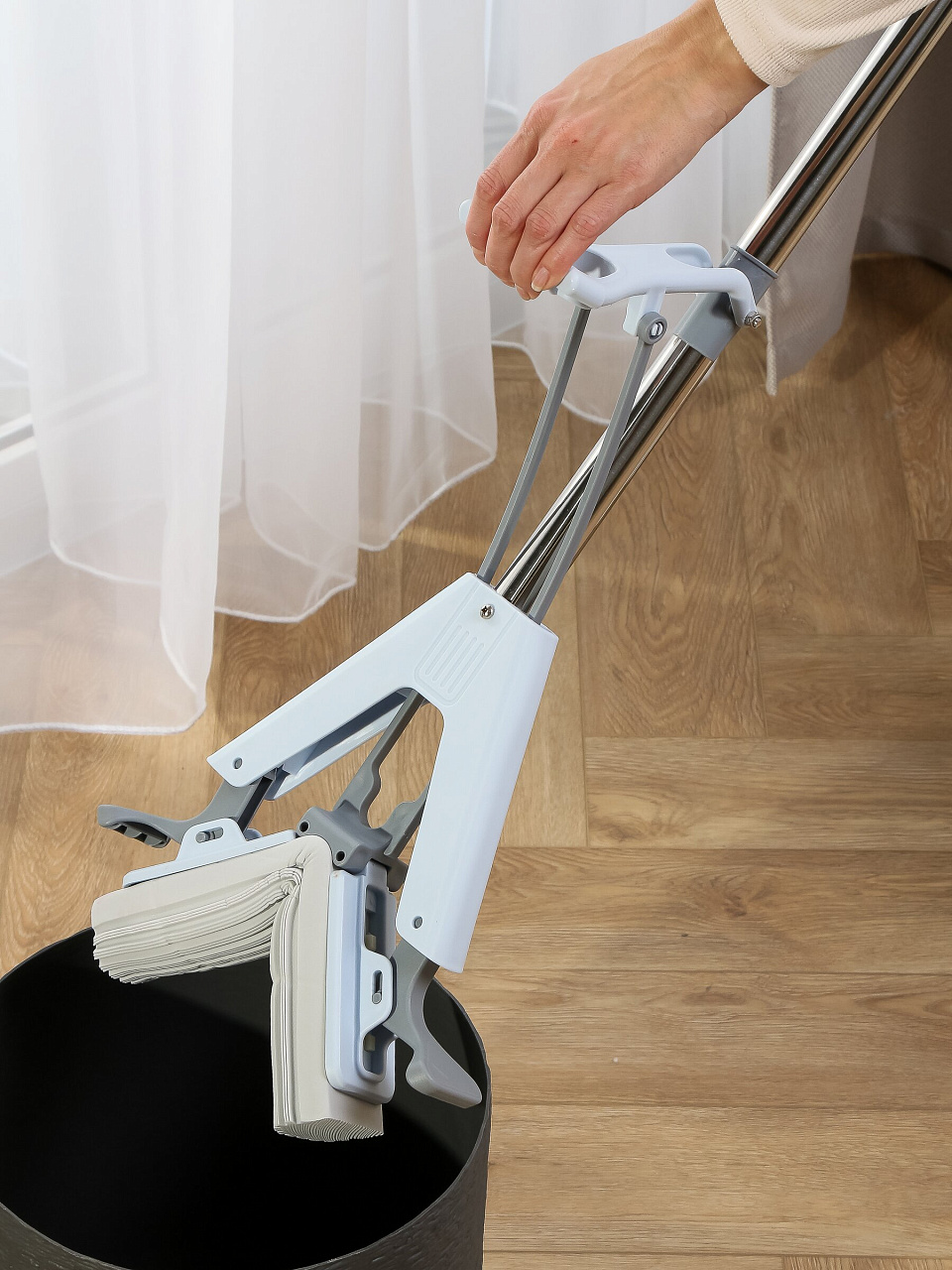 Механизм отжима позволяет избежать контакта с грязной водой, экономит время, а телескопическая ручка облегчает уборку в труднодоступных местах.
