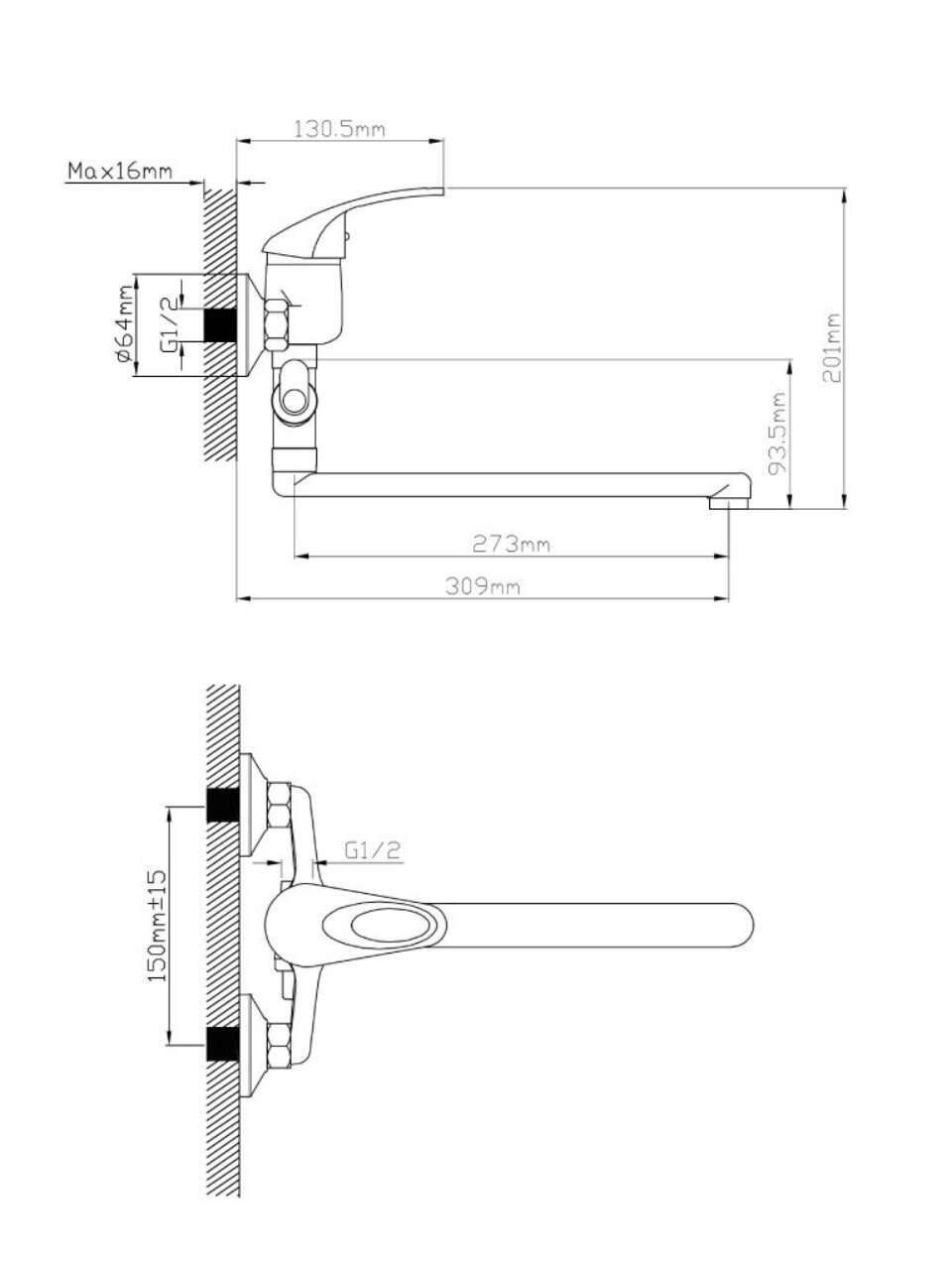 Модель рассчитана на вертикальный настенный монтаж с эксцентриками, подходит для стандартных межосевых расстояний 150 мм и крепится на 2 отверстия.