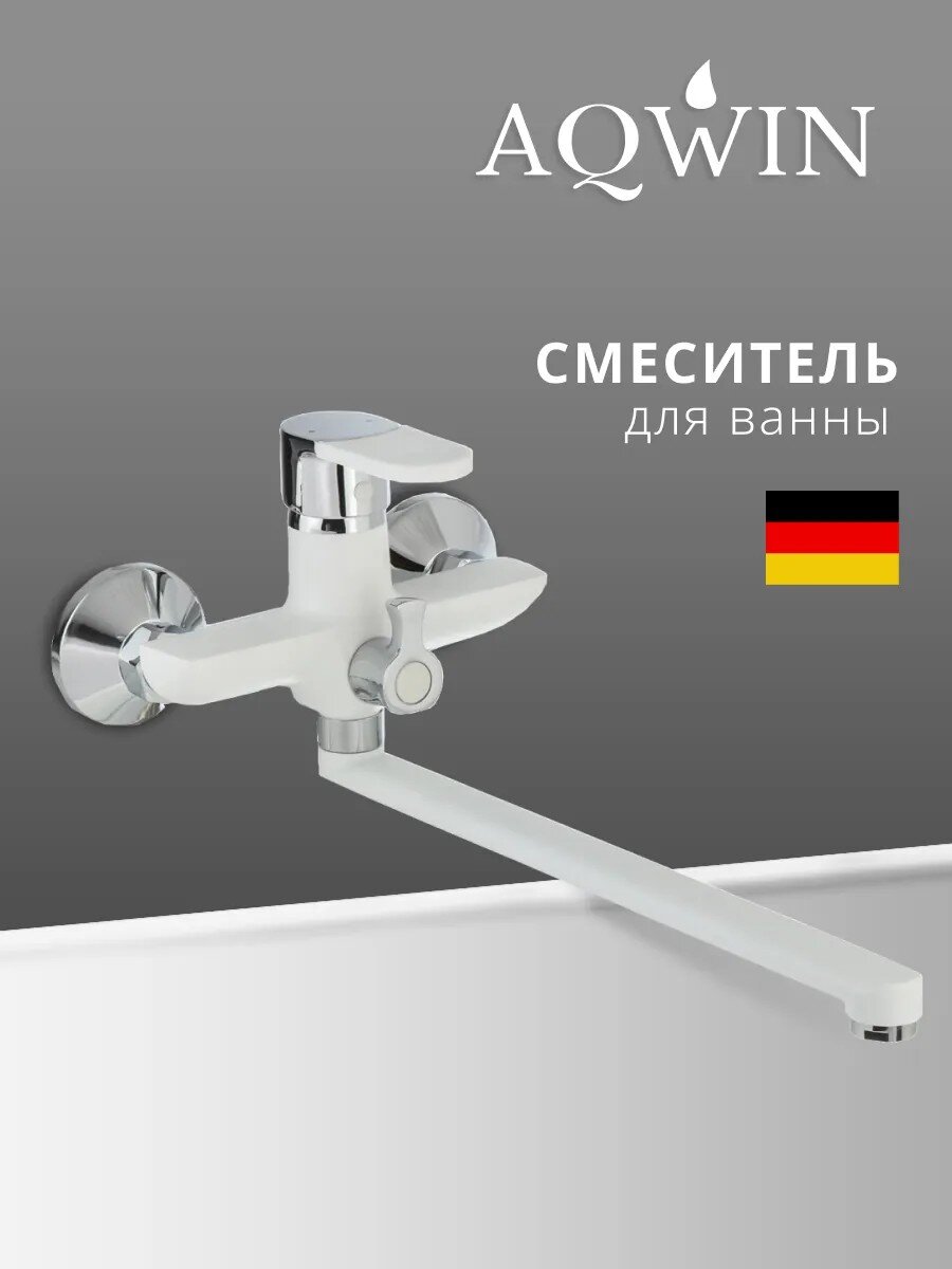 Смеситель для ванны Aqwin A22223-7: белый матовый корпус, длинный поворотный излив 35 см, керамический картридж — надёжность и стиль для вашего дома.