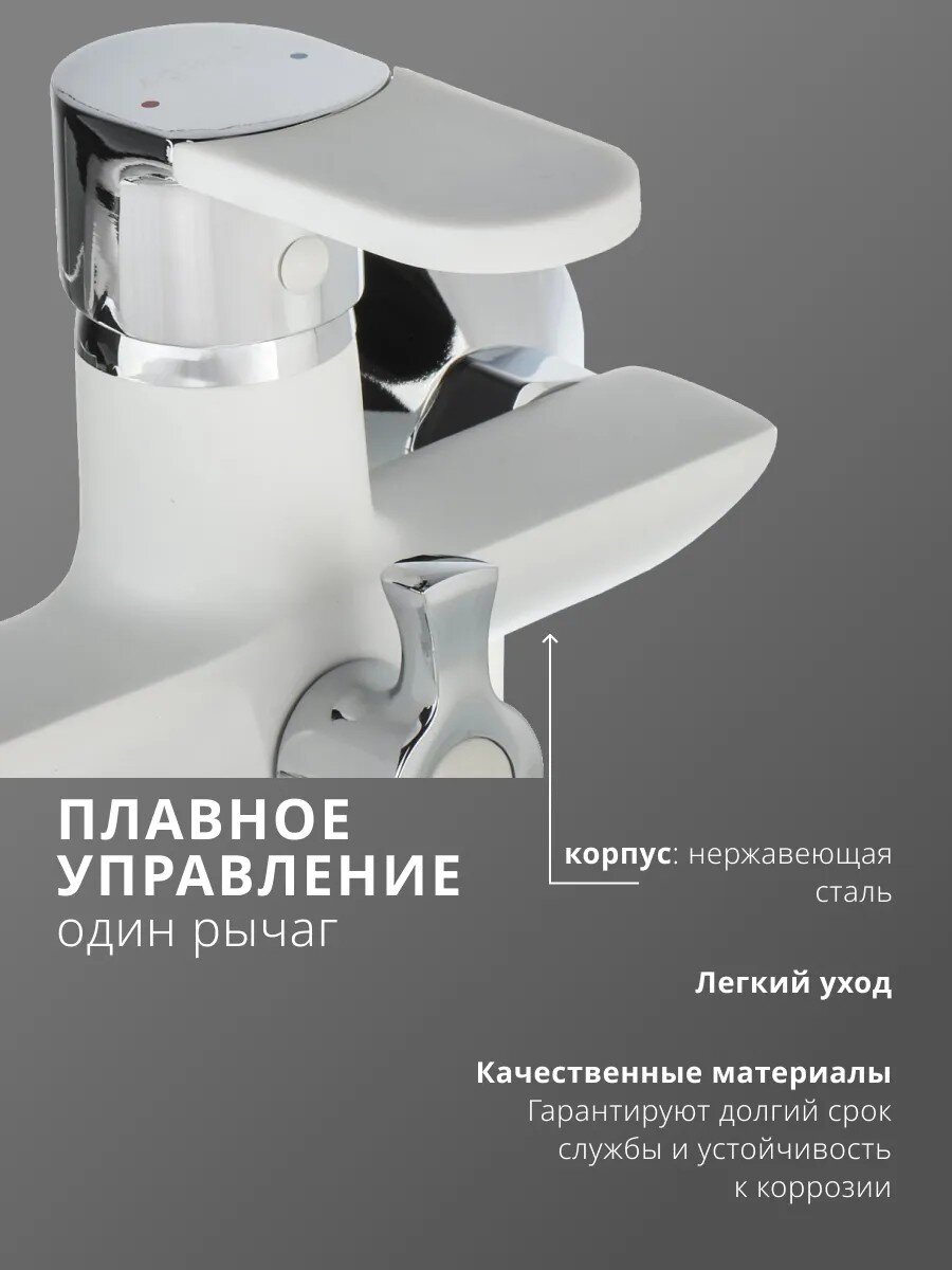 Смеситель для ванны Aqwin A22223-7 — оптимальный выбор для тех, кто ищет сочетание функциональности, стиля и надёжности. Благодаря длинному поворотному изливу (35 см) и универсальному монтажу на стену, этот смеситель удобно использовать как для наполнения ванны, так и для душа. Белый матовый корпус из цинкового сплава устойчив к царапинам и не желтеет со временем, а керамический картридж обеспечивает плавное и точное регулирование температуры воды без протечек.