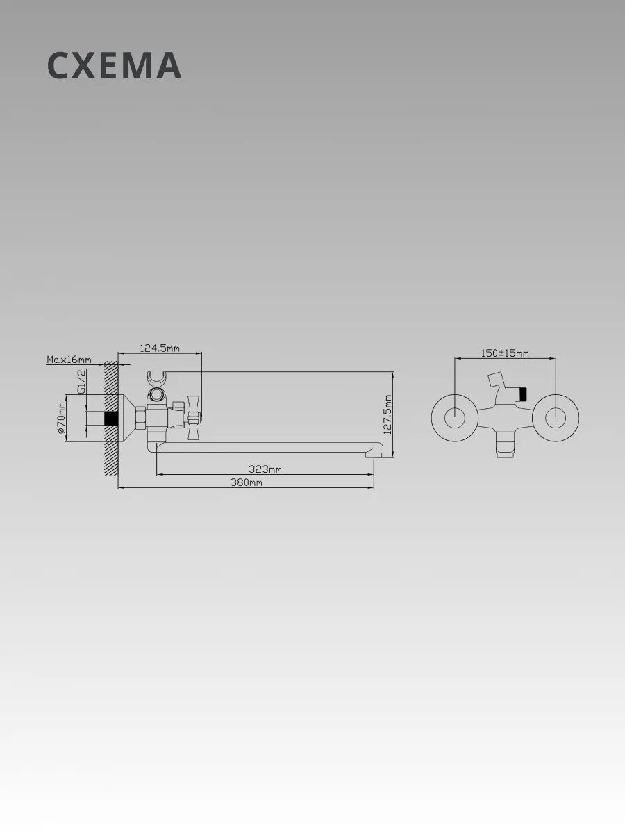 Модель Aqwin A23315 — оптимальный вариант: двухвентильное управление, длинный поворотный излив, комплект с лейкой и шлангом, универсальное настенное крепление на 2 отверстия (межосевое расстояние 150 мм).