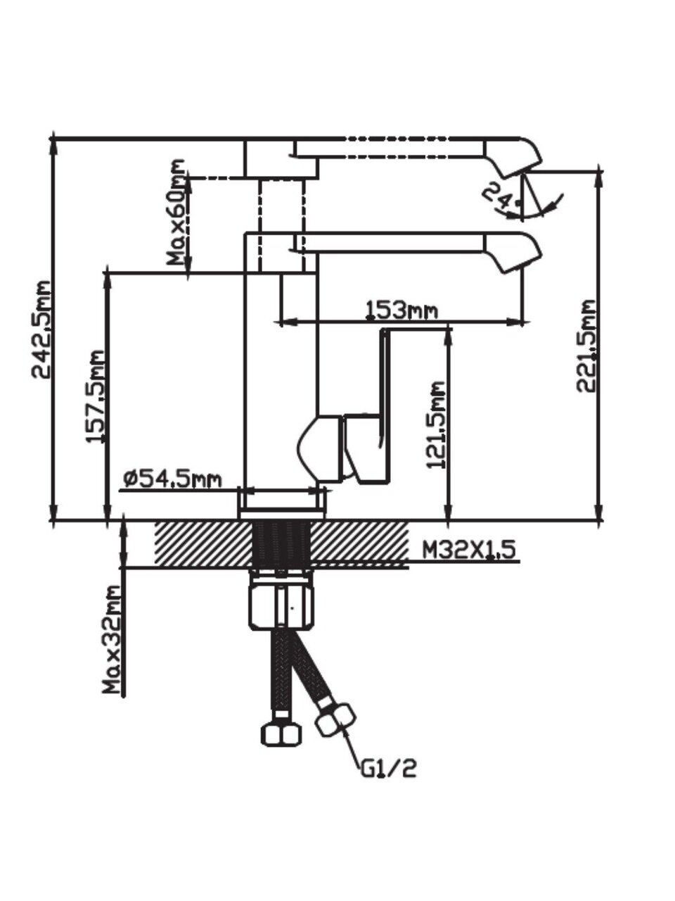 Для монтажа требуется одно отверстие диаметром 32 мм, стандарт подключения шланга — 1/2 дюйма. В комплекте — две гибкие подводки по 35 см.