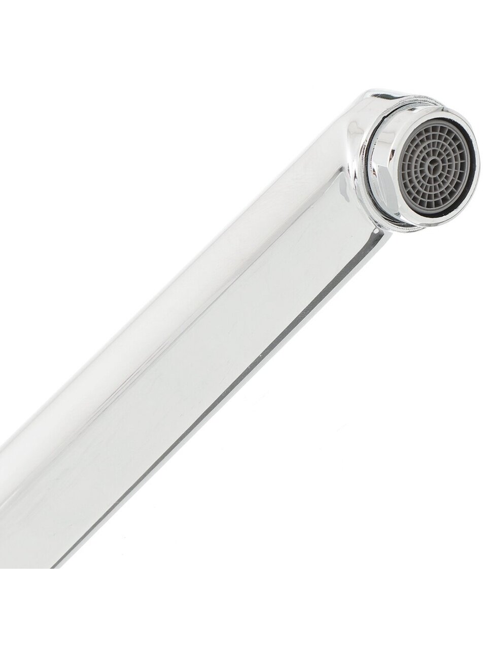 - Длинный поворотный излив 32,1 см и корпус из силумина — удобно для больших ванн, устойчив к коррозии, глянцевая поверхность легко очищается