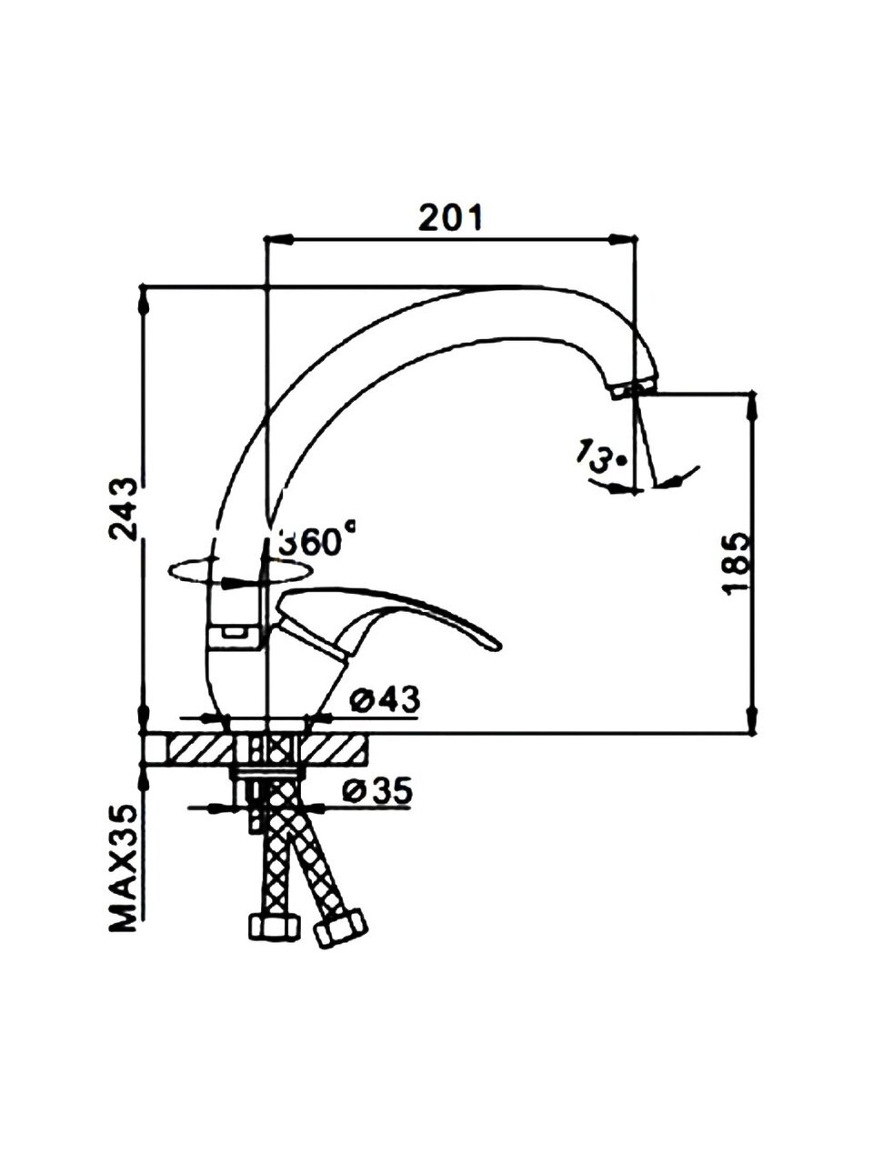 Высота излива — 18,5 см, длина — 20,1 см, монтажное отверстие — 43 мм, подводка 1/2". Установка горизонтальная, крепление на одну мойку с помощью шпильки.