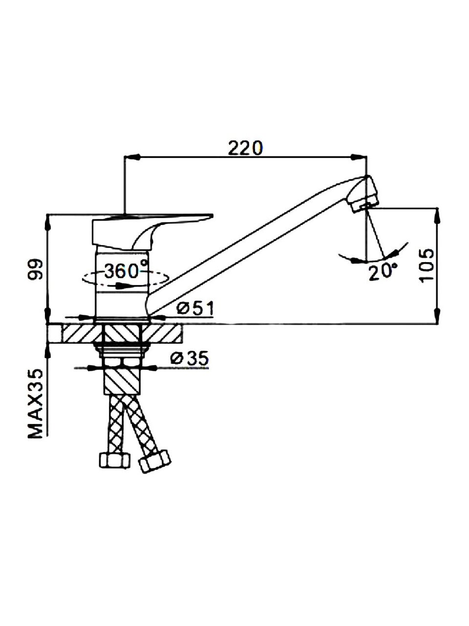 Излив средней длины — 22 см, высота 10,5 см. Это оптимально для стандартных и глубоких моек, удобно для повседневного использования.