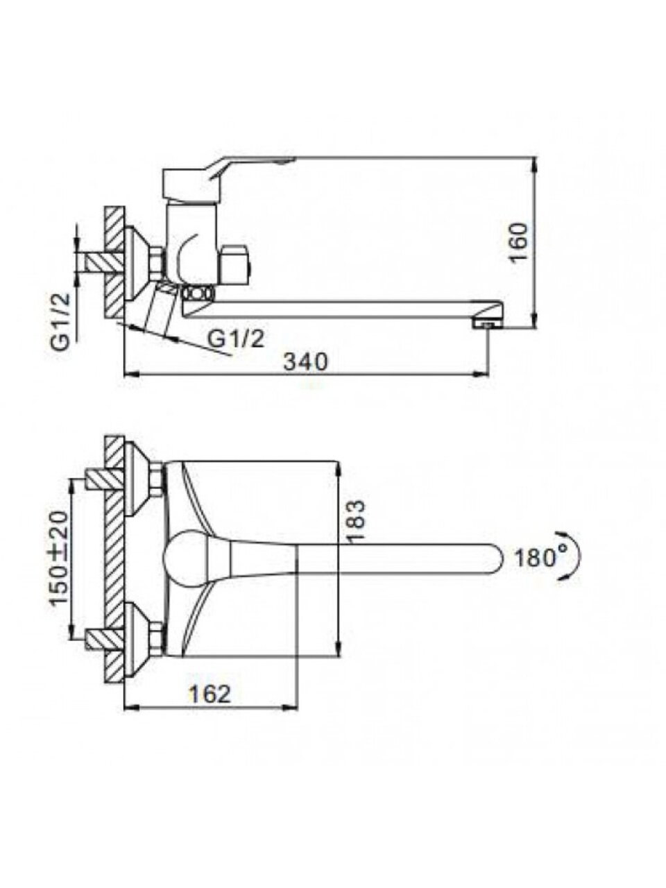 Длина излива — 30 см, монтаж настенный (вертикальный), межосевое расстояние 150 мм, крепление на два отверстия с помощью гайки, стандарт подводки 1/2".