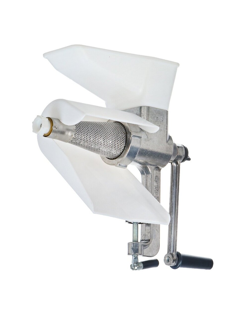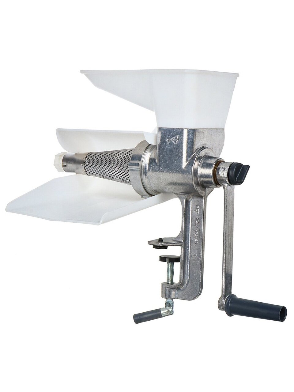 Ручная соковыжималка позволяет быстро готовить соки из фруктов, ягод или овощей. Корпус соковыжималки изготовлен из алюминия, что делает соковыжималку легкой и прочной. Для дополнительного удобства в эксплуатации, ручная соковыжималка имеет механизм для регулировки интенсивности выхода сока, а также прижимное устройство с резиновыми башмаками, для обеспечения прочного крепления к краю стола. В комплект поставки входит полипропиленовый лоток, который предотвращает разбрызгивание сока.