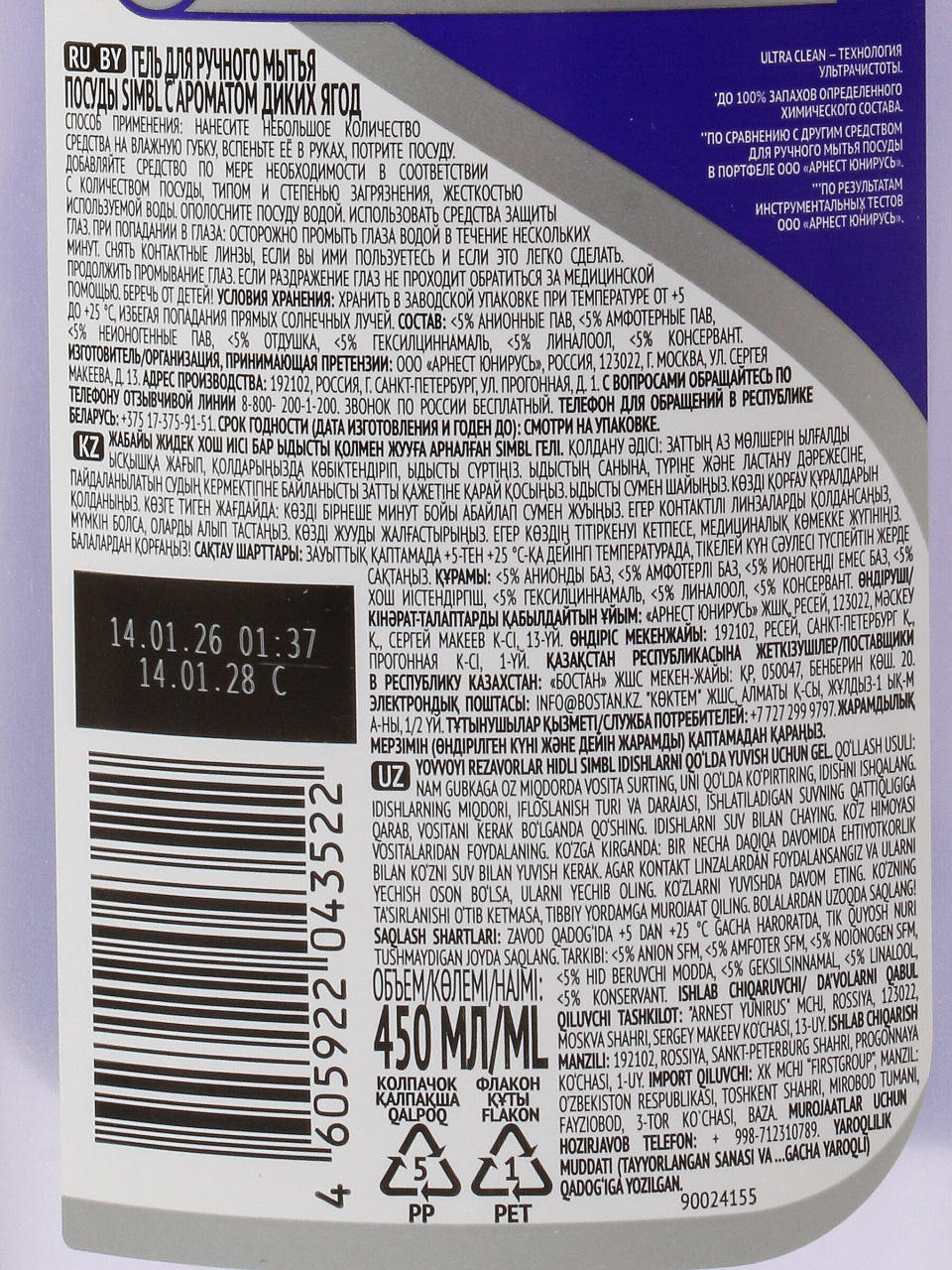 Средство для мытья посуды Simbl, 450 мл: чистота без усилий, свежий аромат диких ягод, экономичный расход — идеальный выбор для заботы о семье и доме.
