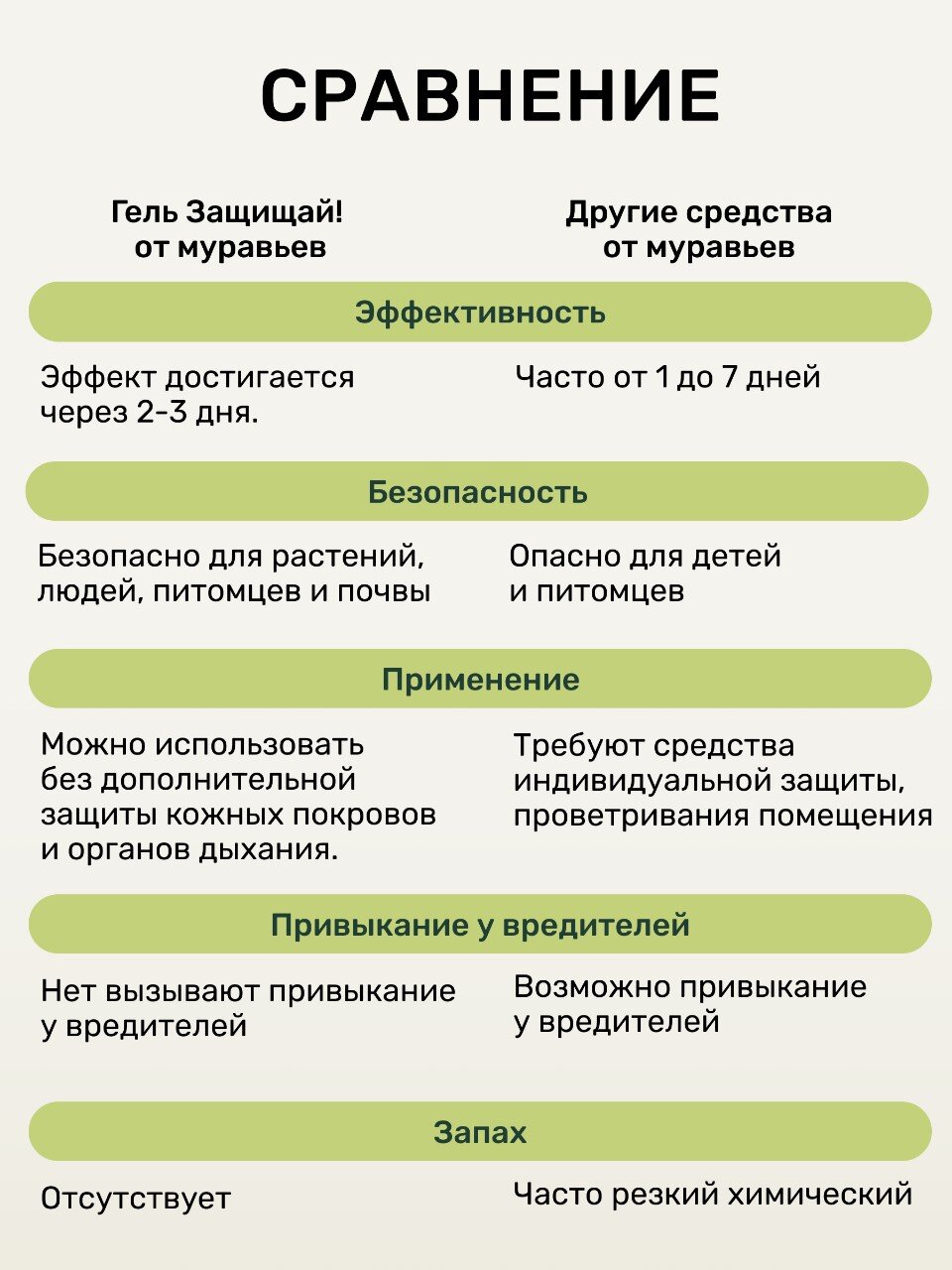 В отличие от порошков и аэрозолей, инсектицид-гель действует локально, не распространяется по воздуху и не оседает на поверхностях. Благодаря густой консистенции средство прочно держится на горизонтальных и вертикальных поверхностях, что увеличивает срок его действия. Как использовать гель от муравьев? Просто выдавите небольшое количество в местах скопления насекомых или на их тропах. Подходит ли для кухни? Да, при условии отсутствия прямого контакта с пищей. При сравнении с аналогами гель "Защищай!" выигрывает по простоте нанесения и отсутствию запаха.